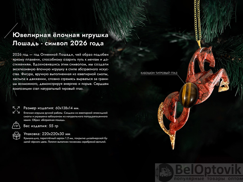Игрушка бережно упакована в картонную коробку с внутренним вкладышем, который надежно фиксирует её внутри. Для вашего удобства к игрушке прилагается цепочка или ленточка, с помощью которой вы легко сможете подвесить её на ёлку.