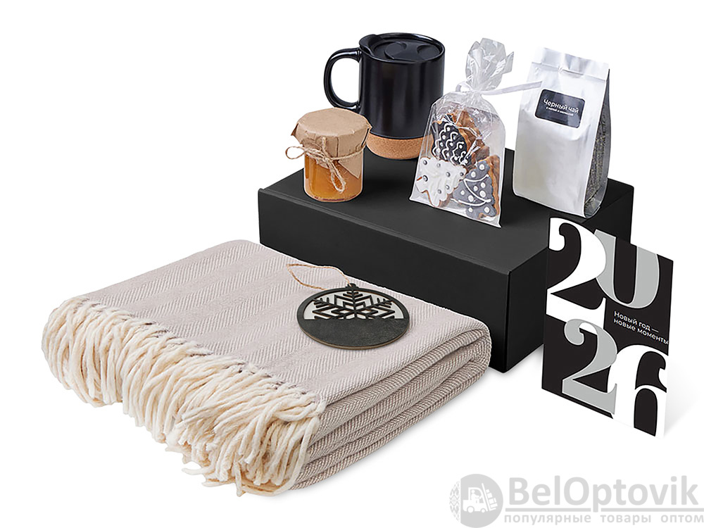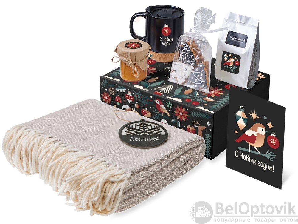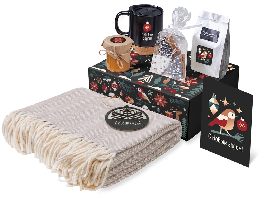 - Материал товара: плед - 100% хлопок; кружка - керамика, пробка; подвеска - дерево; открытка - бумага