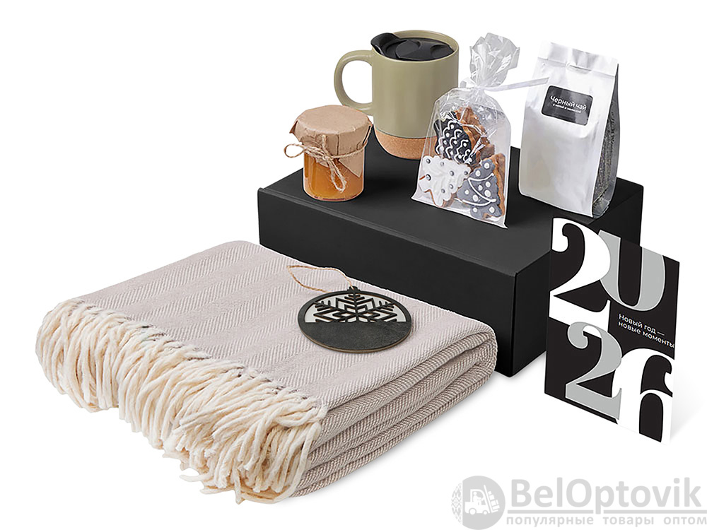 - Материал товара: плед - 100% хлопок; кружка - керамика, пробка; подвеска - дерево; открытка - бумага