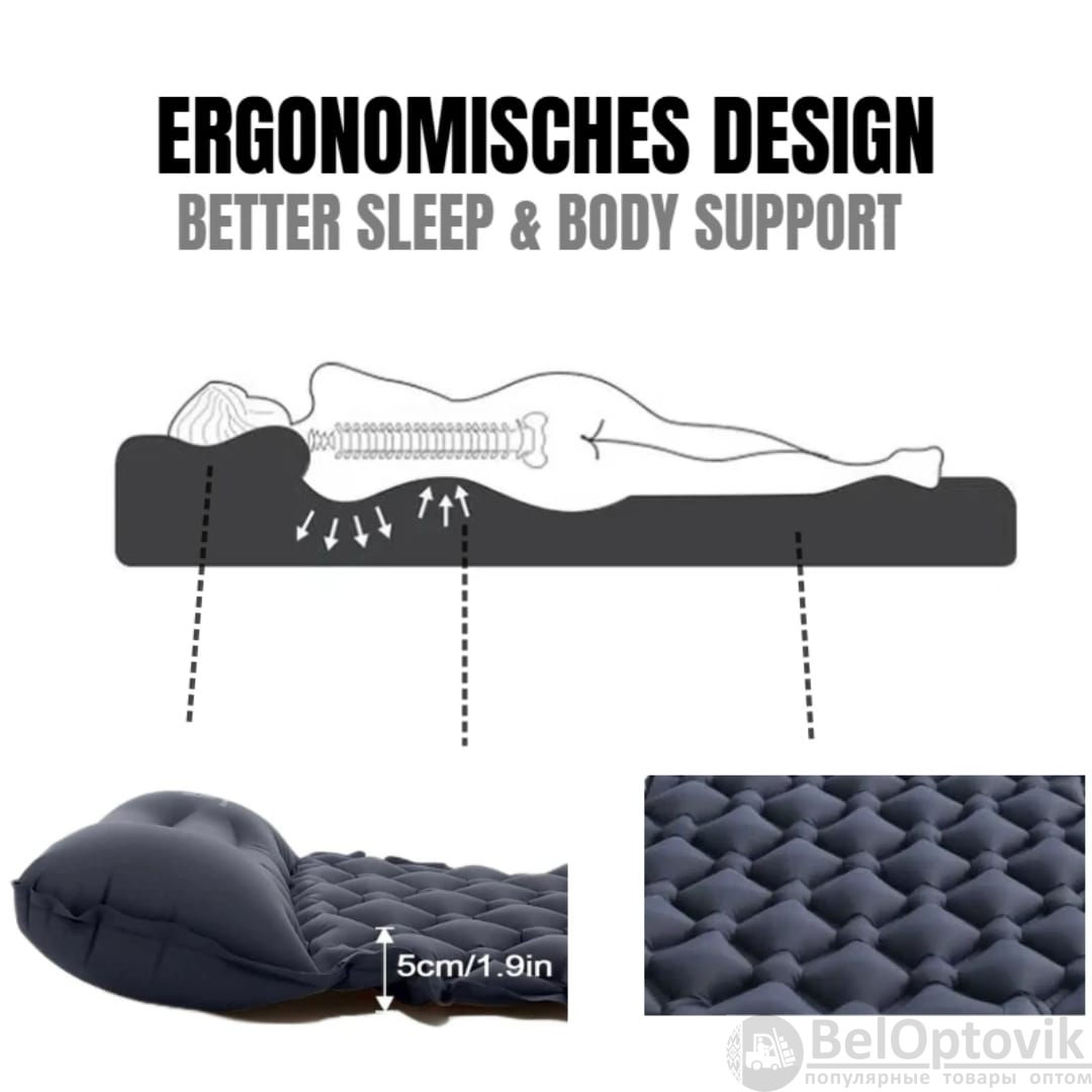 - Надувной матрас SLEEPING PAD c воздушной подушкой– универсальное изобретение. Годится для туризма, путешествия, турпоходы, палатки, посиделки у костра.