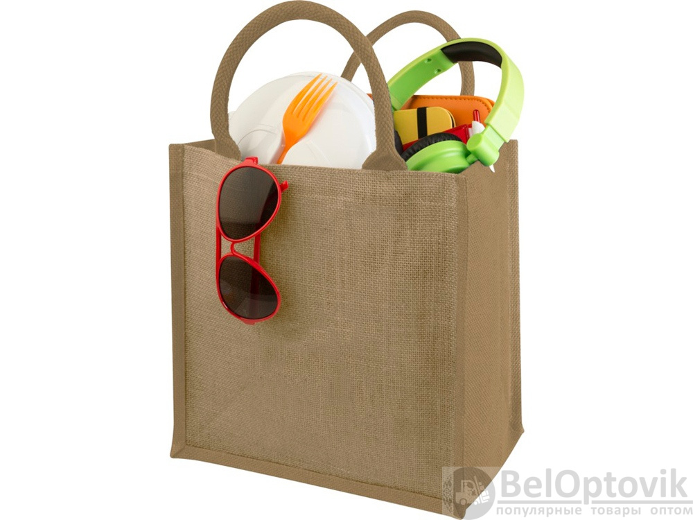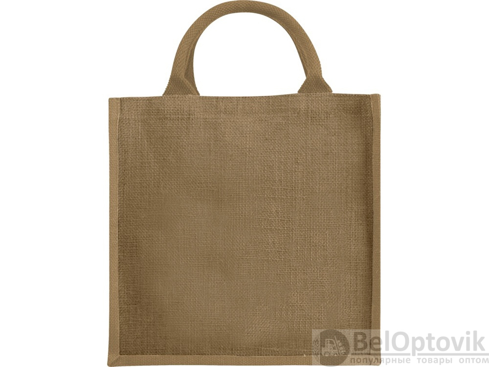 Джутовая подарочная сумка Chennai. Джутовая сумка с ламинированным открытым основным отделением и вставкой. Хлопковые ручки высотой 11,5 см. Джут.