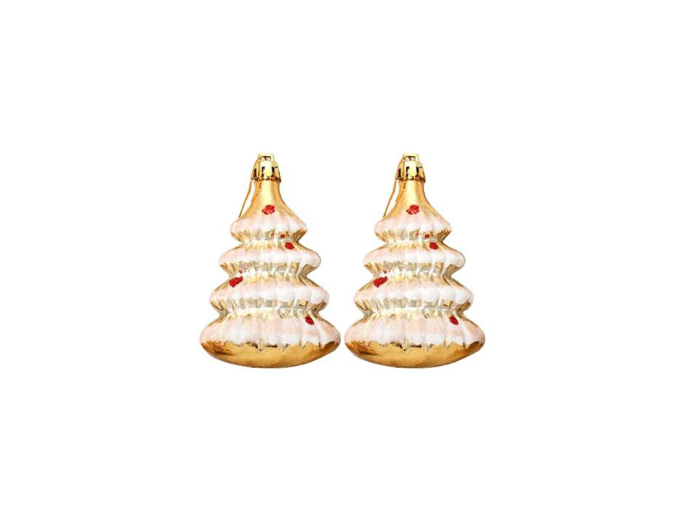 Новогодние украшения в оригинальной форме елочки будут отлично смотреться на вашей ели. Золотой цвет игрушек делает атмосферу радостнее и праздничнее. Такие украшения будут красиво смотреться как на белой, так и на зеленой хвое. В набор входят 2 елочных игрушки, которые выполнены из пластика - легкого и прочного материала, поэтому они будут красоваться на вашей елке не один год. Такой набор послужит отличным подарком для ваших близких.