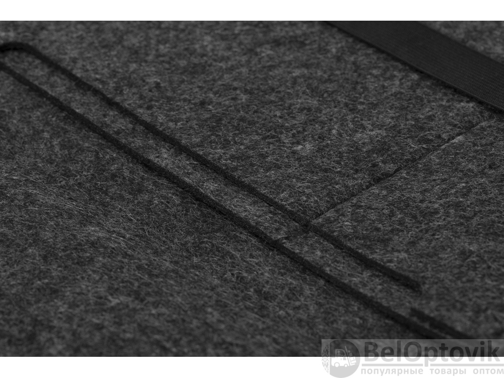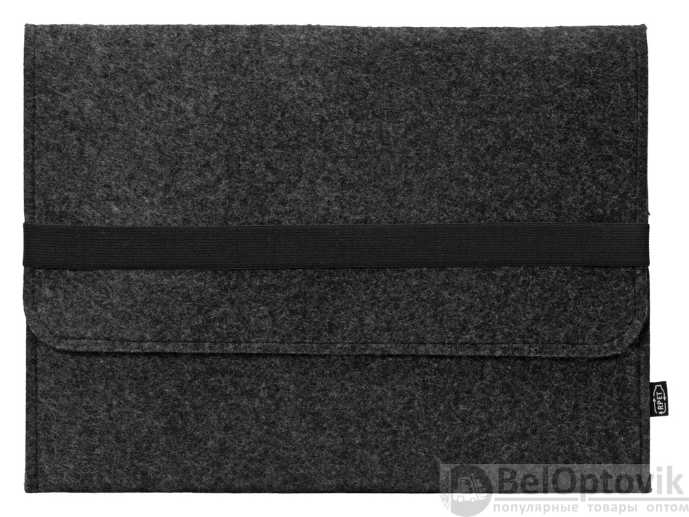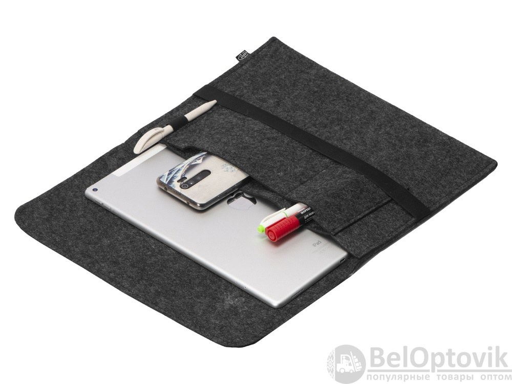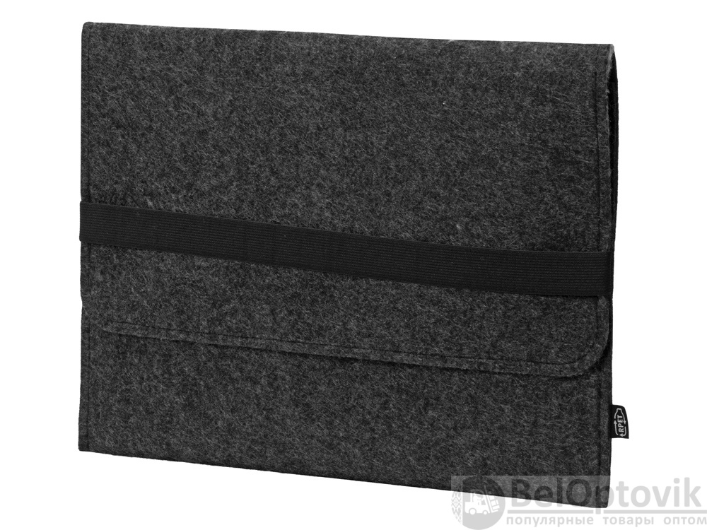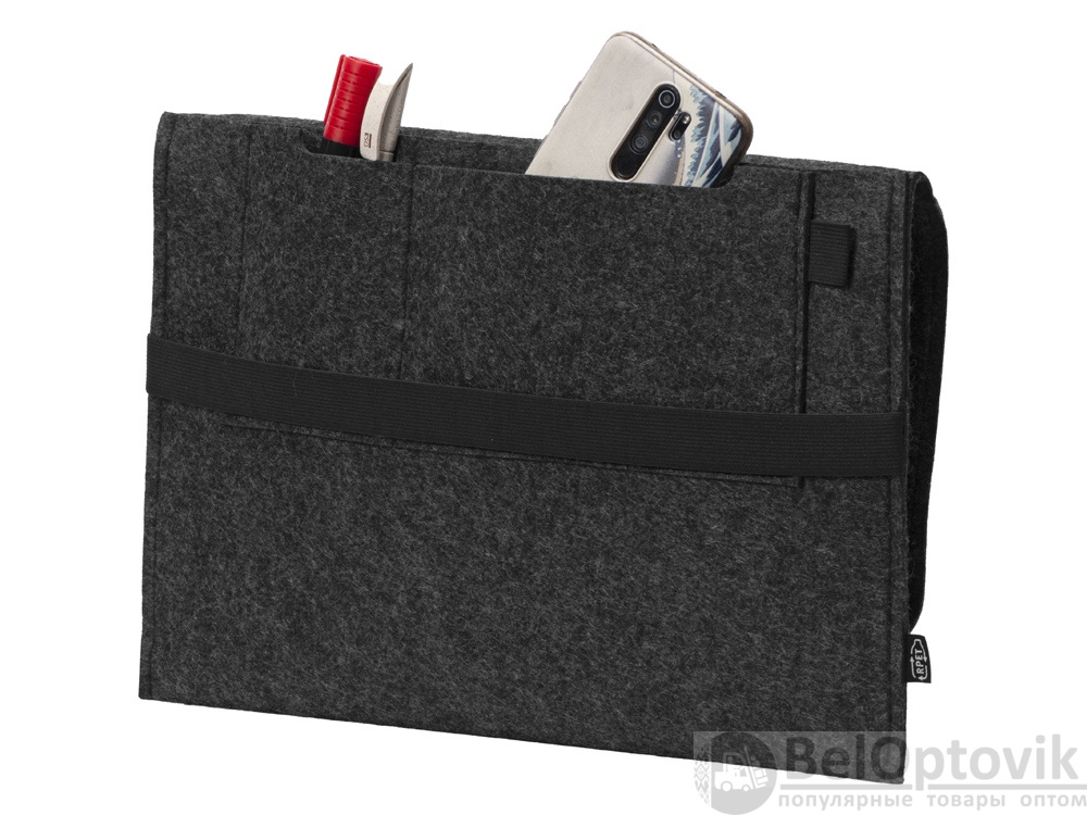 Чехол для ноутбука выполнен из фетра толщиной 3 мм. С передней стороны расположен органайзер размером 13x27 см для канцелярских принадлежностей, карт и телефона. Чехол фиксируется в закрытом виде с помощью эластичной ленты.