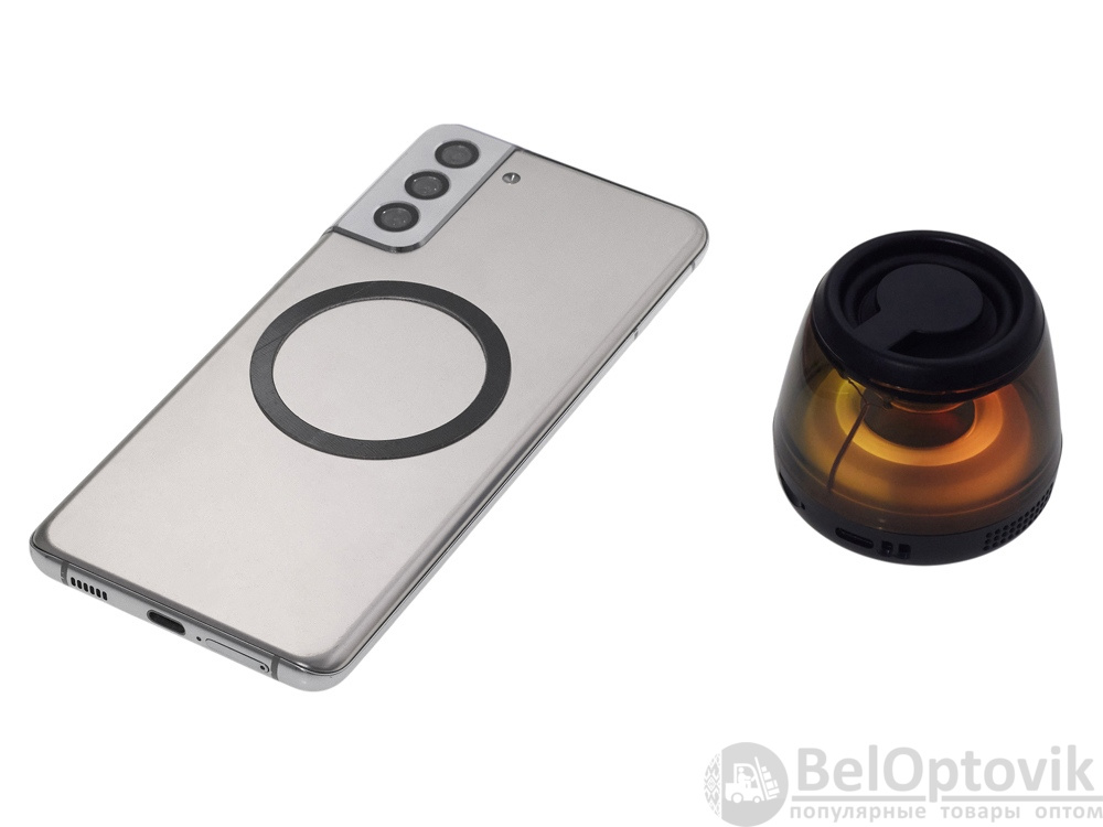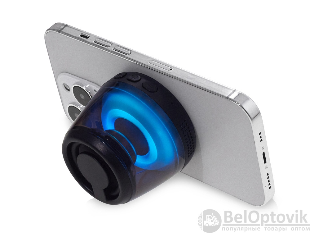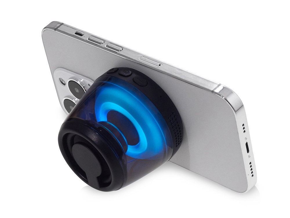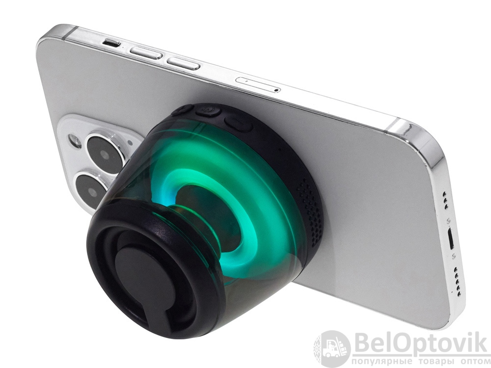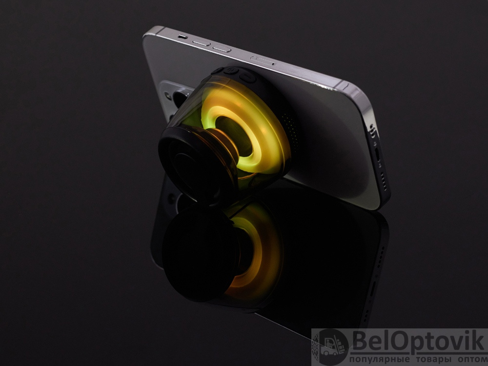Современная магнитная Bluetooth-колонка колонка крепится к любому смартфону (iPhone -нативно, к другим -благодаря кольцу из комплекта). Это позволяет не только освободить руки, но и добавляет удобную подставку телефону. Динамик 40мм и мощностью 5 Вт обеспечивает сильное и насыщенное звучание даже в компактном корпусе. RGB подсветка имеет несколько режимов (переключение по трехразовому нажатию кнопки ВКЛ.). В комплекте кроме кольца – зарядный кабель USB-C и ремешок-ланъярд. Может принимать звонки и имеет разъем для micro SD карт памяти.