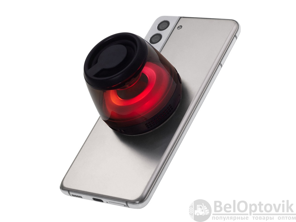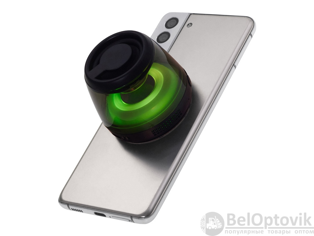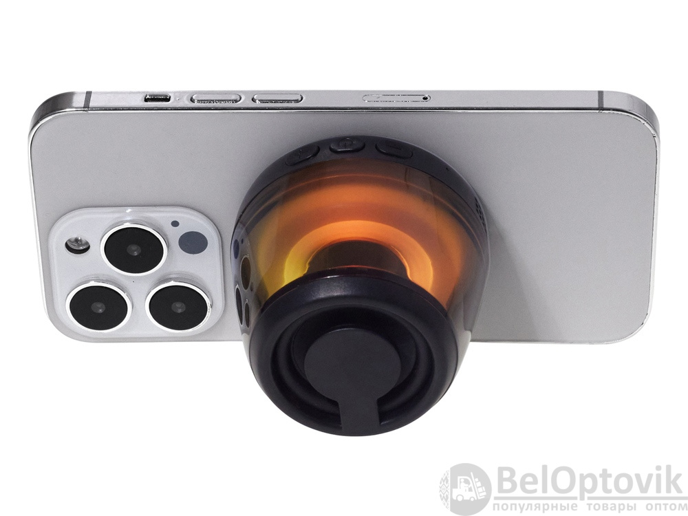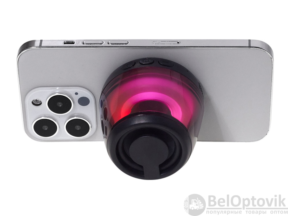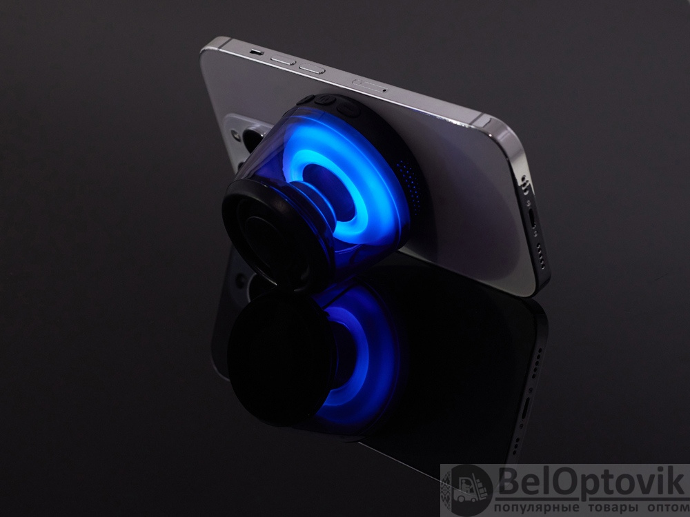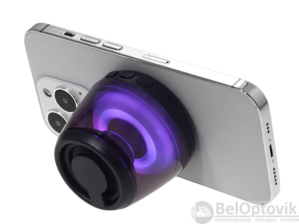 Современная магнитная Bluetooth-колонка колонка крепится к любому смартфону (iPhone -нативно, к другим -благодаря кольцу из комплекта). Это позволяет не только освободить руки, но и добавляет удобную подставку телефону. Динамик 40мм и мощностью 5 Вт обеспечивает сильное и насыщенное звучание даже в компактном корпусе. RGB подсветка имеет несколько режимов (переключение по трехразовому нажатию кнопки ВКЛ.). В комплекте кроме кольца – зарядный кабель USB-C и ремешок-ланъярд. Может принимать звонки и имеет разъем для micro SD карт памяти.