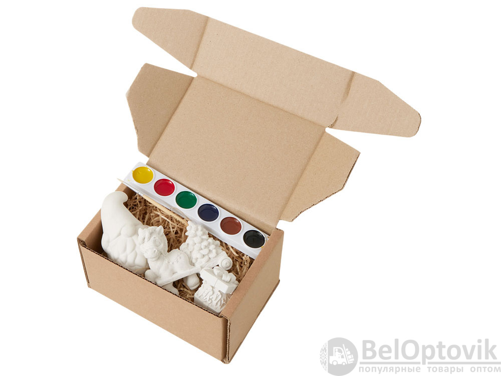 В набор входят три гипсовых фигурки — лошадка елочкой, гном подарочная коробка с пряничными человечками, а также акварельные краски и кисть.