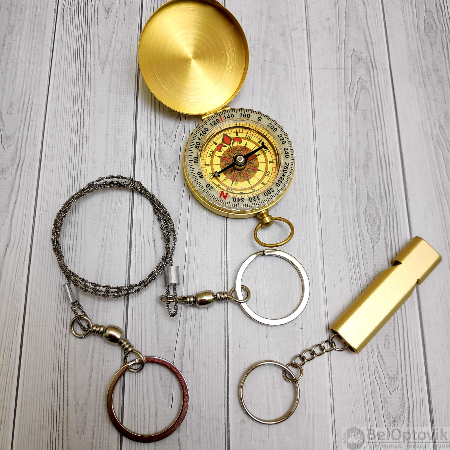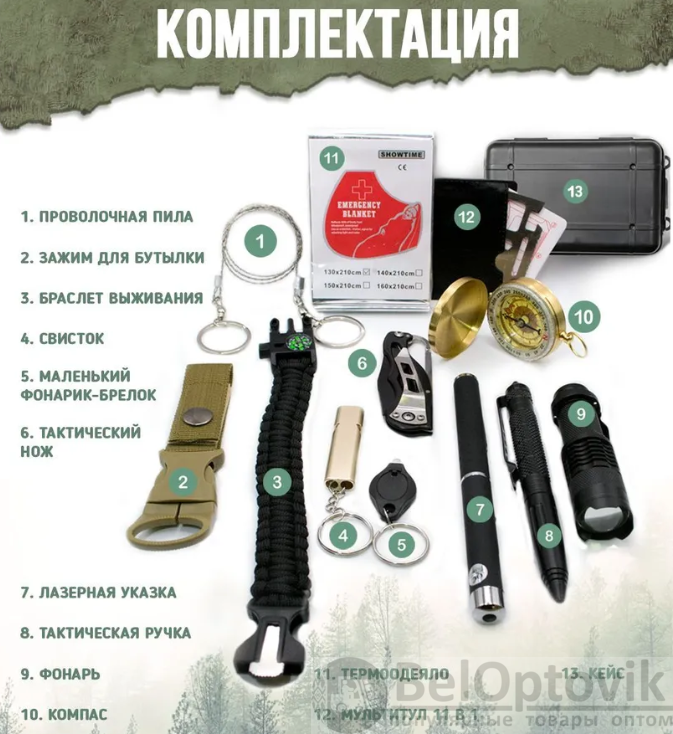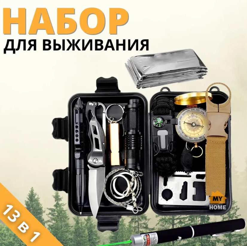 Походный набор для выживания, 13 предметов, в котором имеется все необходимое для комфортного и безопасного путешествия. В наборе есть компас для беспрепятственной навигации, а также целый ряд небольших и незаменимых предметов (нож, фонарик, карандаш).