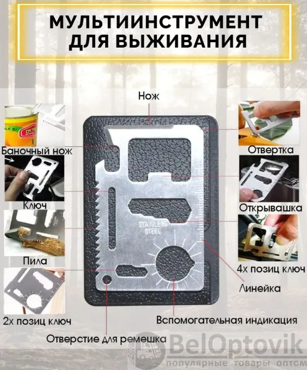 Мульти-инструмент 13-в 1: компактный, включает - консервный нож, открывалку бутылок, ключи различных функций, вспомогательный указатель направления, отвертку, нож, пильное полотно, линейкуили отверстие для брелка-1шт.