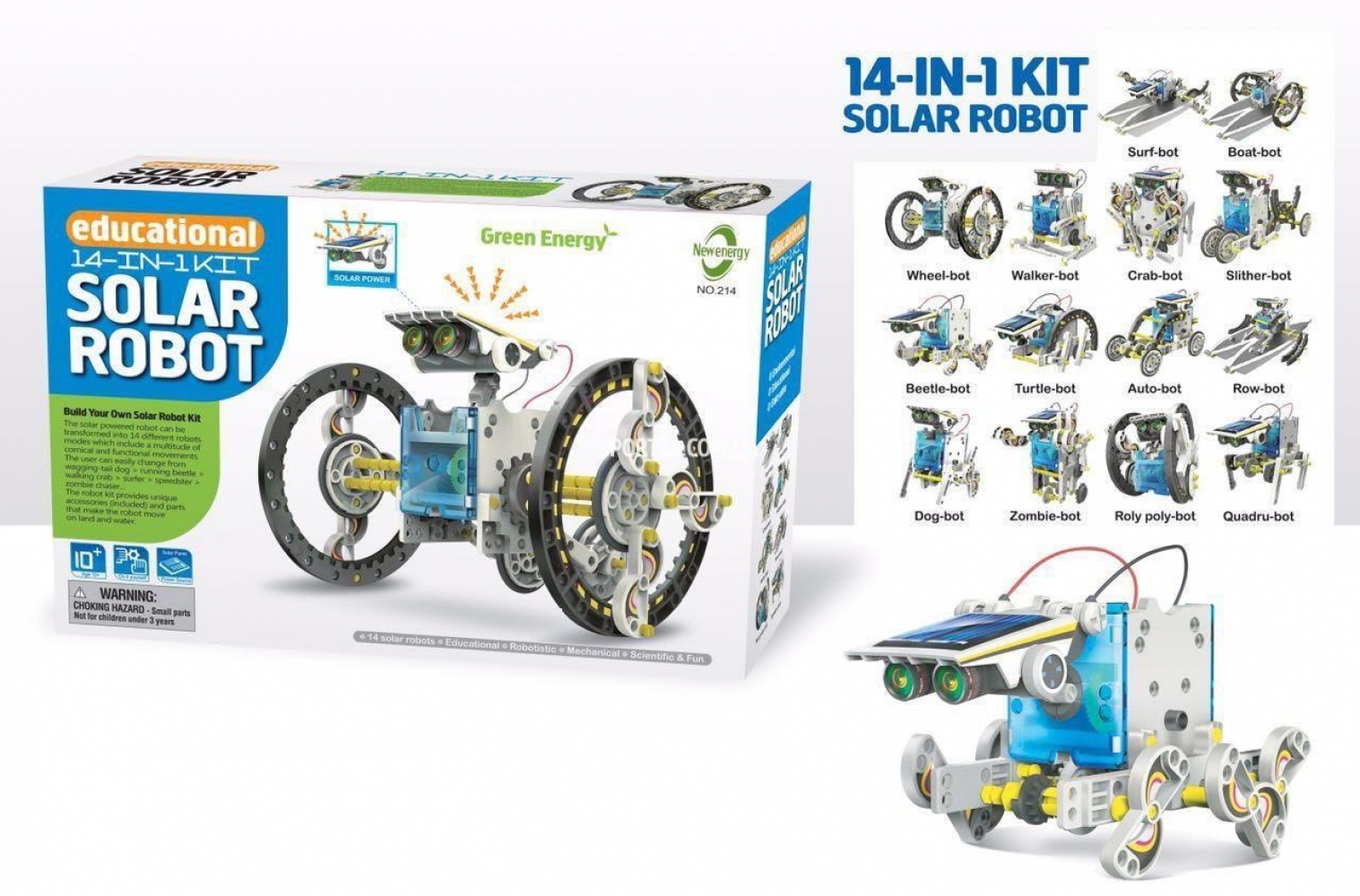 - Конструктор превращается в 14 разных роботов, работающих на солнечных батареях. Роботы, собранные из конструктора, выполняют различные комические и функциональные движения, такие, как виляние хвостом собаки-бота, походка жука, скольжение, гребля и т.д.