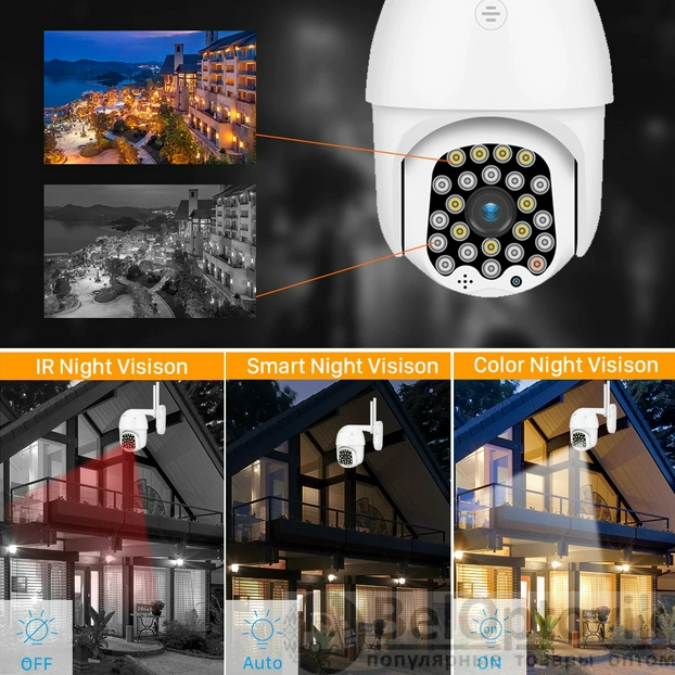 Поддерживает автоматическое переключение между режимами ночной съемки (чёрно-белое ночное видео с инфракрасной подсветкой либо цветное ночное видео с белой светодиодной подсветкой (опционально) и режимом дневной съемки (без подсветки).