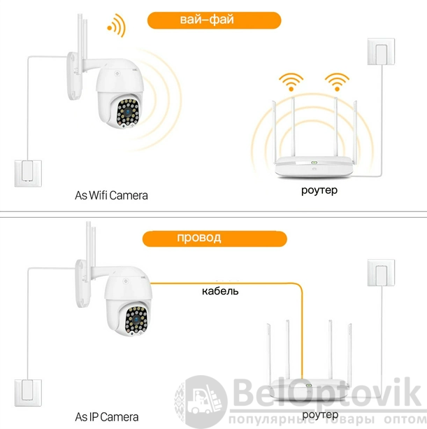 Камера наблюдения имеет поворотные антенны, для уверенного приёма сигнала от Вашего смартфона, а также разъём RJ45 для альтернативного сетевого подключения к интернету.
