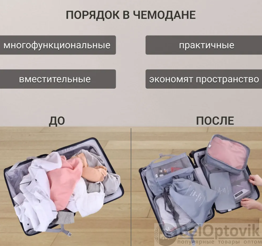 Наши дорожные органайзеры для чемодана представляют собой удобный и практичный набор органайзеров, который поможет вам организовать и упаковать вещи в вашем чемодане. Органайзеры предназначены для хранения одежды, обуви, косметики, аксессуаров и других мелочей, которые часто теряются в пути.