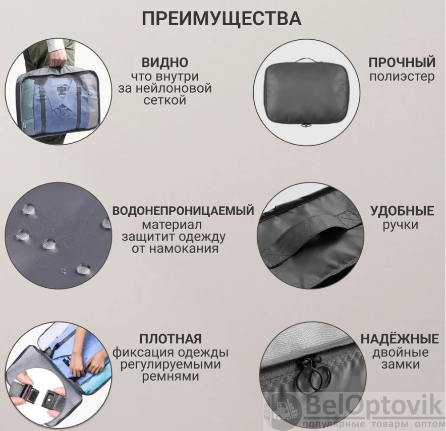 Набор органайзеров для чемодана состоит из нескольких модулей разных размеров, которые легко помещаются в вашем чемодане. Каждый модуль имеет маркировку, что позволяет быстро найти нужную вещь. Органайзеры для чемодана также могут быть использованы как отдельные сумки для путешествий.