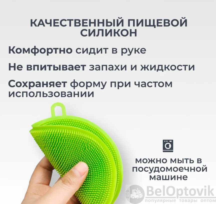 Губка для мытья выполнена из качественного мягкого силикона, она хорошо сидит в руке, быстро сохнет, не впитывает запахи и жидкости, а также сохраняет форму даже при частом использовании.