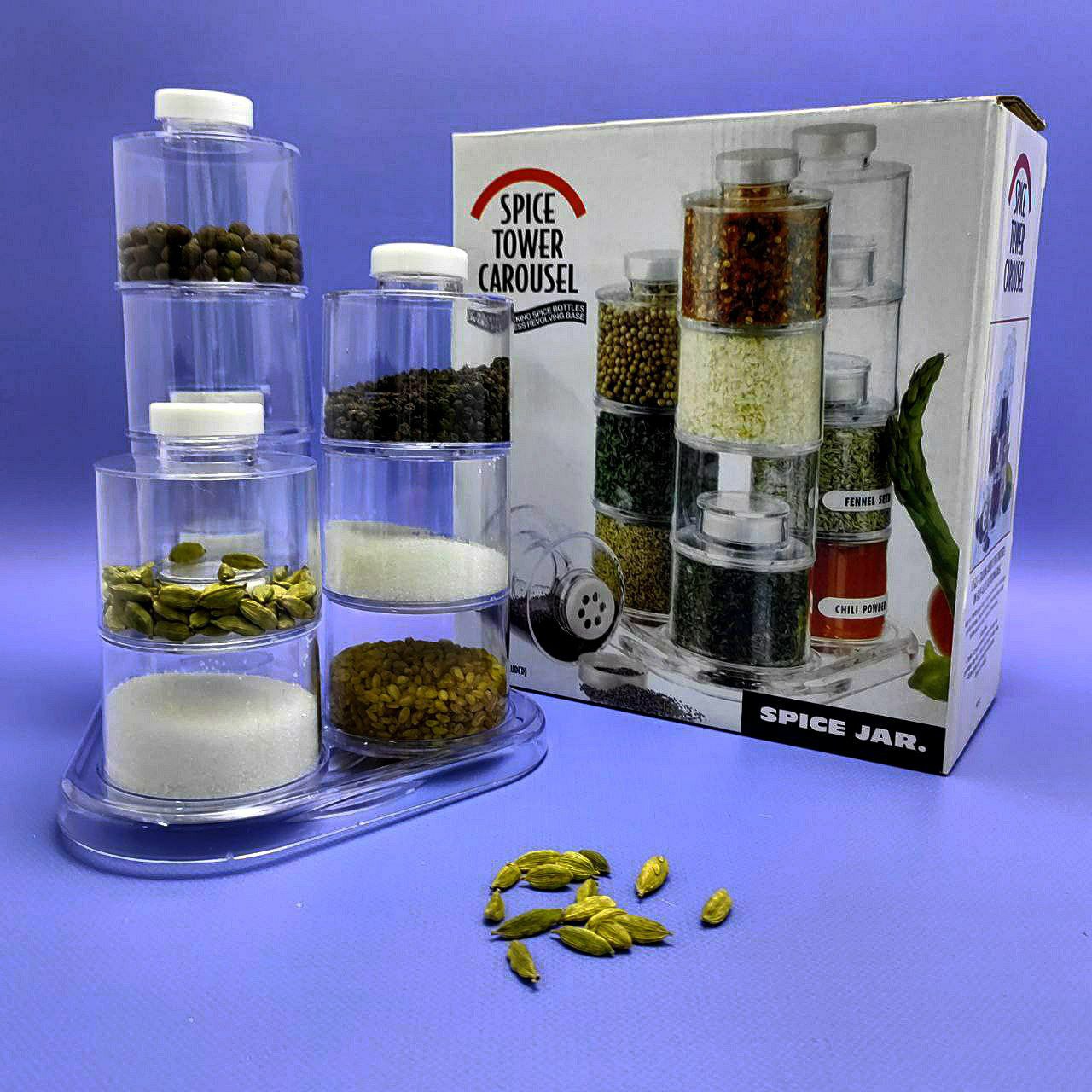 Баночки плотно и надежно закрываются, благодаря чему ароматные приправы не потеряют свои свойства и запах. Благодаря прозрачности емкостей можно увидеть содержимое и убедиться, что Вы взяли именно то, что хотели. Карусель-подставка легко крутится и позволяет по кругу выбрать нужную Вам приправу.