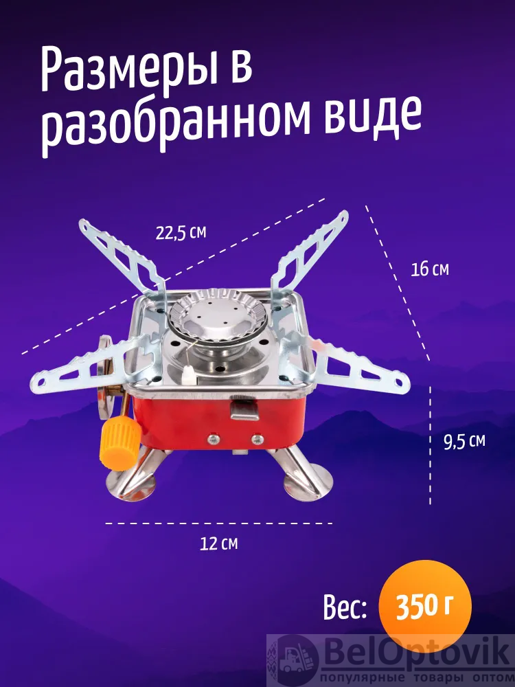 Корпус изготовлен из качественного металла. Разъем для подключения баллона расположен на стороне корпуса. На одной из боковых сторон расположен рычаг для включения пьезоэлемента и регулятор подачи газа. Плавная регулировка мощности горения. Внизу газовой плиты находятся складные ножки. Рекомендуется использовать в качестве индивидуальной портативной плиты для 3 или 4-х человек. Внимание! Перед установкой баллона следует перекрыть газовый вентиль горелки!