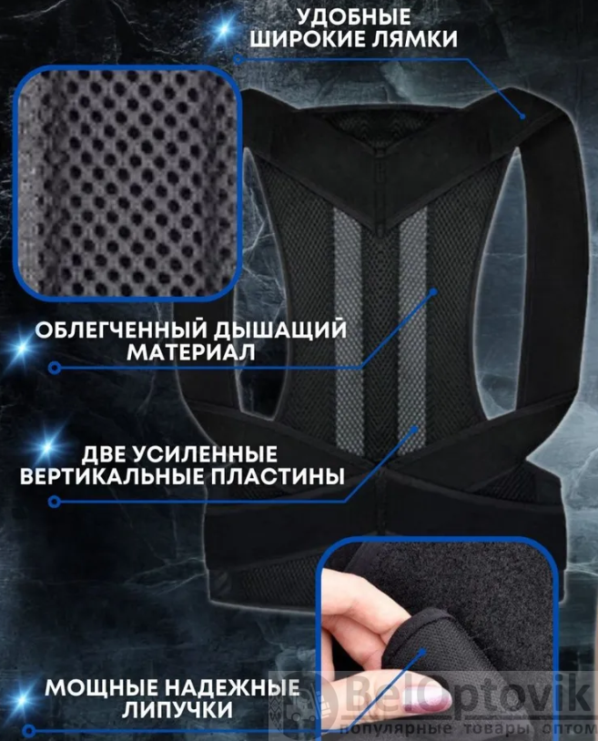 Корсет для осанки имеет два ребра жесткости, удобные липучки-застежки и эластичные плечевые лямки, сам корректор изготовлен из дышащего материала, благодаря чему изделие не натирает при длительном ношении.