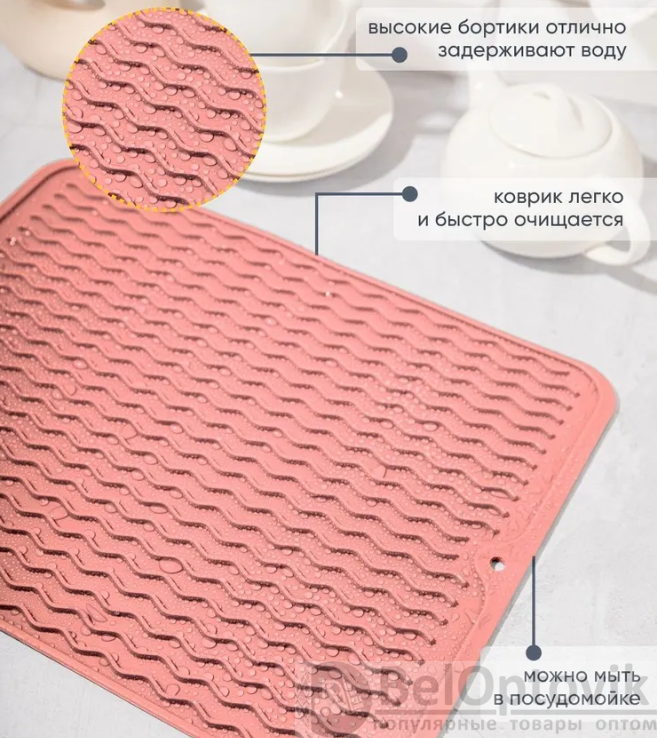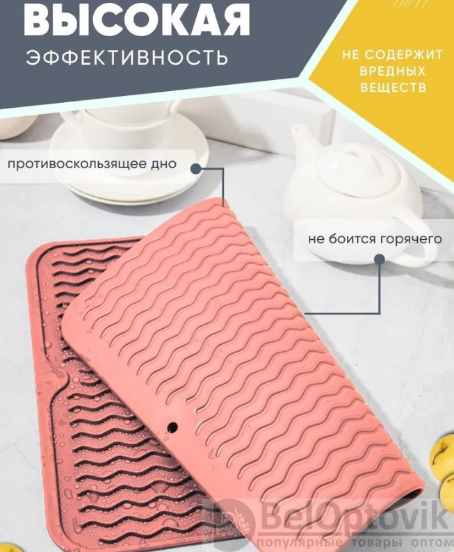 Благодаря водонепроницаемому материалу вода будет скапливаться исключительно на поверхности сушилки. Высокие бортики не позволят жидкости проникнуть на стол, в шкаф или на раковину - никаких луж и испорченной мебели, от аналогов наш коврик отличается практичностью!