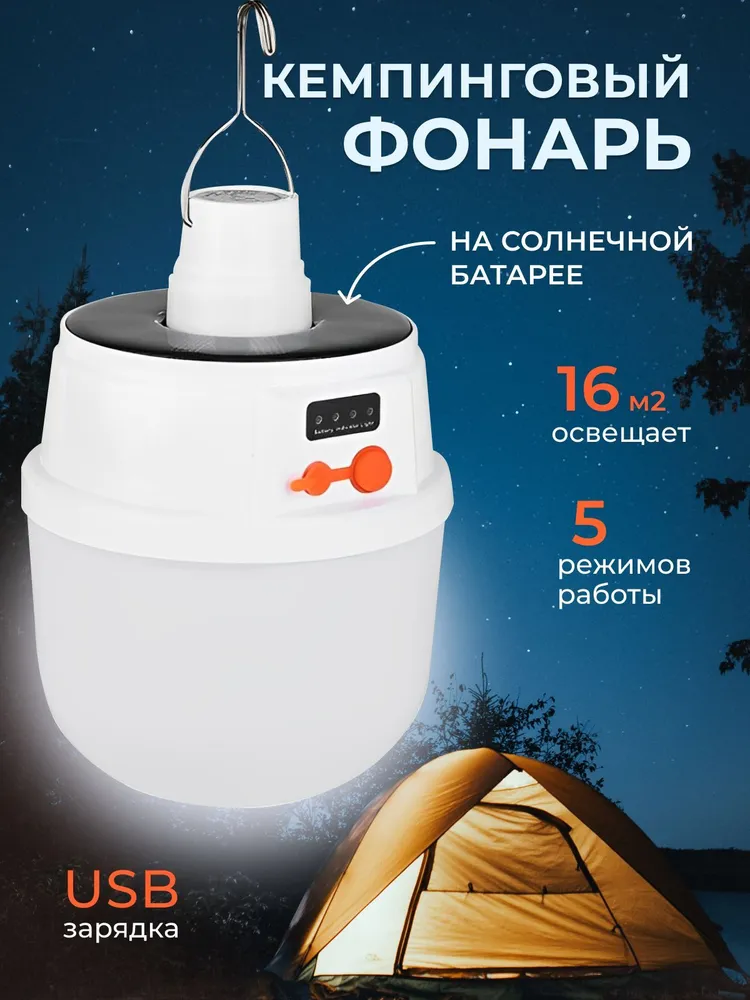 Светодиодный фонарь для кемпинга. Подвесной кемпинговый фонарь - хит лета 2023! УЛУЧШЕННАЯ МОДЕЛЬ с двумя мощными аккумуляторами и более удобным способом зарядки. Благодаря этому фонарь для похода светит ярче и дольше! Фонарь белый на крючке пригодится для дачи, гаража, сада или похода с палатками. Фонарь для кемпинга аккумуляторный заряжается от электричества либо от солнечной батареи - что расширяет его функциональность и дает вам больше свободы в его использовании по сравнению со светильниками, которые работают только от солнца или зарядки. Индикатор зарядки всегда подскажет вам, когда фонарь походный светодиодный пора зарядить. Беспроводной светильник. Можно подвесить к чему угодно за крючок. Просто прикрепите светильник в нужном месте. Размер фонаря достаточно компактный – 14.50 х 11.00 см, его удобно переносить с собой, без проблем поместится в рюкзак или сумку. При этом фонарик имеет несколько режимов яркости и светит гораздо ярче, чем костер - выбирайте тот режим, который подойдет для конкретного случая или освещенности.