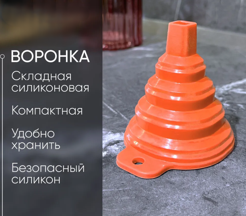 Пищевая силиконовая воронка подойдёт для бутылок с узким или широким, круглым, овальным или квадратным горлышком. Воронка идеальна как для кухонных дел так и в любом другом (автомобиль, туризм и т.д.).