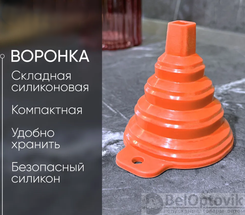 Воронка складная – имеет гофрированную форму, что позволяет использовать воронку с любой тарой от бутылки до канистры. При этом легко складывается и не займёт много места в тумбочке. Специальный круглый носик помогает выходить воздуху из тары, жидкость не застаивается в воронке.