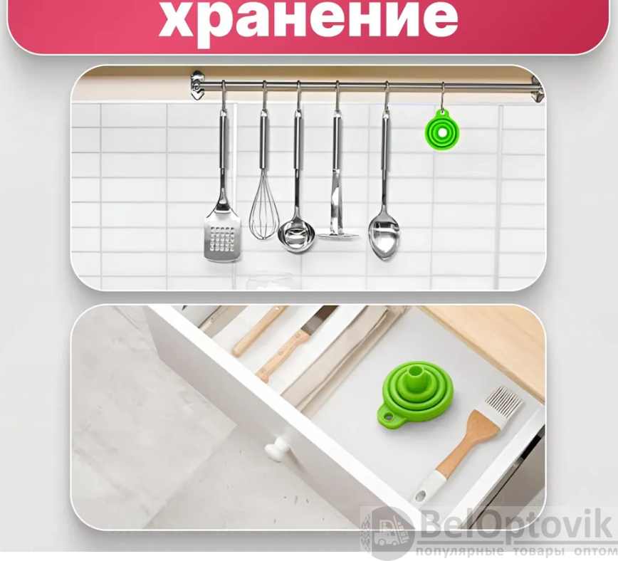 За счёт своей компактности воронку удобно хранить- имеется петелька для подвешивания.
