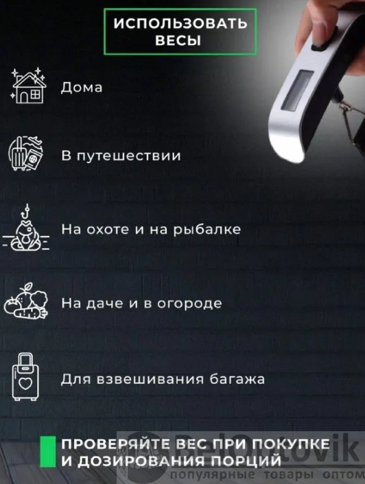 Безмен предназначен для домашнего использования, проведения торговых операций и т. д.. Компактность, небольшой вес, оригинальный дизайн и наличие многих дополнительных функций делают весы для взвешивания просто незаменимыми в любом путешествии или в быту. Весы ручные пригодятся при взвешивании багажа перед поездкой в аэропорт. Имея под рукой весы безмены, Вы также всегда сможете проконтролировать вес покупки на рынке, взвесить улов на рыбалке или урожай, собранный на загородном участке. Весы на батарейках оснащены большим ЖК-дисплеем для отображения веса. Компактные легкие весы обязательно пригодятся на кухне или во время поездок на дачу.