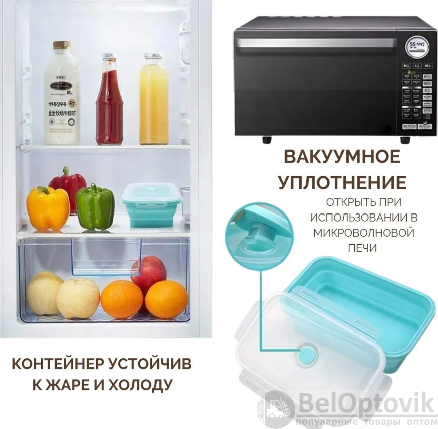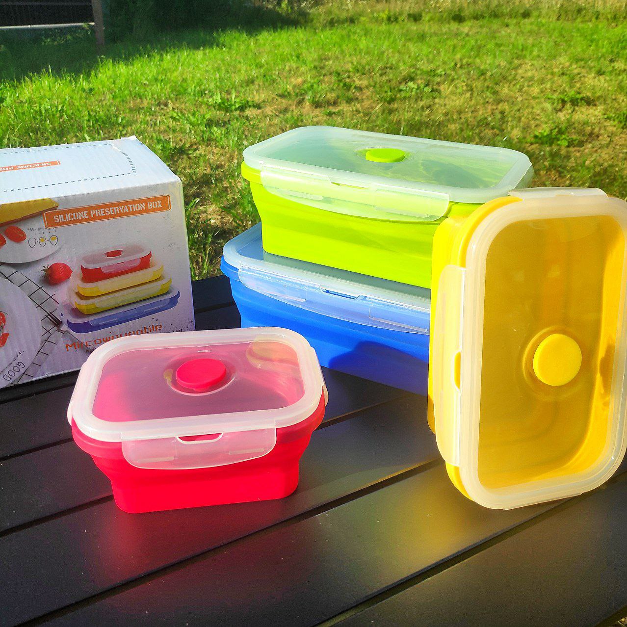 Набор силиконовых складных контейнеров подходит для хранения продуктов и еды, для переноски завтраков (обедов, ужина), транспортировки готовой еды, хранения продуктов в холодильнике или морозильной камере (морозильнике), для подогрева еды в микроволной печи и мойки в посудомоечной машине.