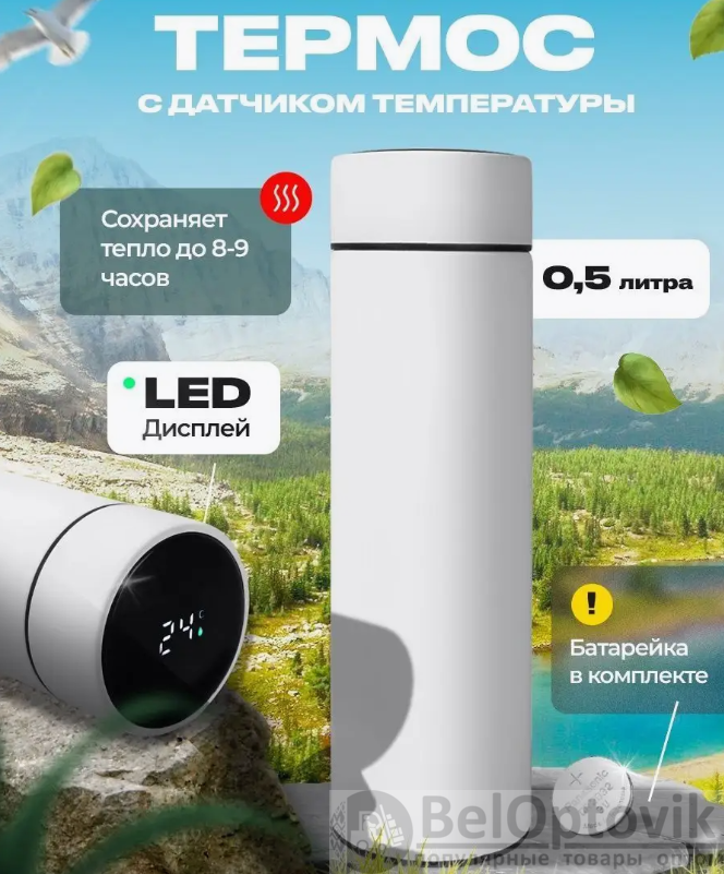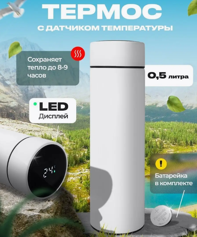 Термос с индикатором температуры и ситечком, 500 мл. / Белый, матовый – 1 шт.;