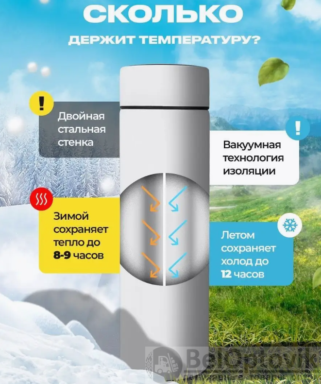 Что такое Термос с индикатором температуры и ситечком, 500 мл. / Белый, матовый