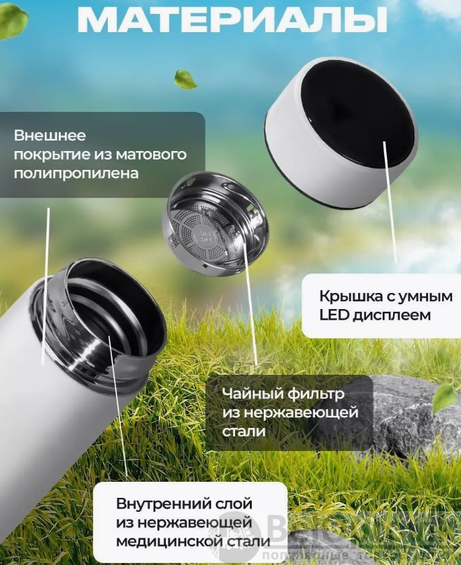 Термос изготовлен из прочной нержавеющей стали. Термос не только сохраняет Ваши напитки горячими, но и показывает насколько они горячие. Уникальная особенность термоса - это сенсорный индикатор температуры, расположенный в крышке. Согласитесь, что довольно удобно знать температуру содержимого термоса, не открывая его. Чтобы узнать температуру внутри термоса, достаточно прикоснуться к поверхности крышки. Встроенный умный чип позволяет экономить заряд, поэтому хватит на весь срок работы термоса. Внутренняя колба изготовлена из высококачественной стали марки SUS 304, что делает термос устойчивым к коррозии. Крышка термоса с внутренней стороны имеет силиконовое кольцо для более плотной изоляции. Для удобства заварки чая непосредственно в термосе предусмотрено съемное ситечко. Размер отверстий вполне подходит для фильтрации мелколистового чая.