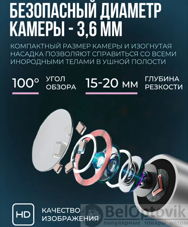 Умная ушная палочка с камерой — это новейшее устройство в уходе за здоровьем ушной полости. Профессиональная, а главное безопасная чистка ушей теперь доступна в домашних условиях. Прибор оснащен качественной камерой с разрешением 1080p и широким углом обзора 360, что позволяет точечно обнаружить и удалить даже самые мелкие загрязнения. Камера фокусируется на конце ушной ложечки и передает изображение по беспроводному каналу Wi-Fi на экран любого смартфона или планшета, в режиме реального времени. Это аппарат, объединивший в себе функционал инструмента для ухода за ушами и средства для осмотра, позволяет удалять серу и другие загрязнения, полностью контролируя процесс и не травмируя ушной проход.
