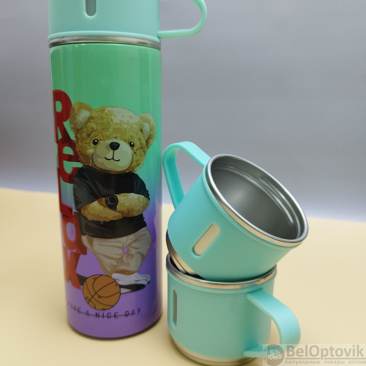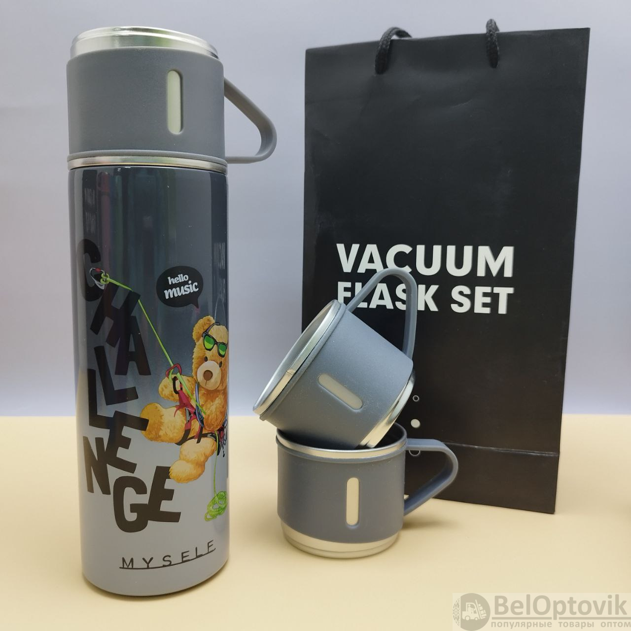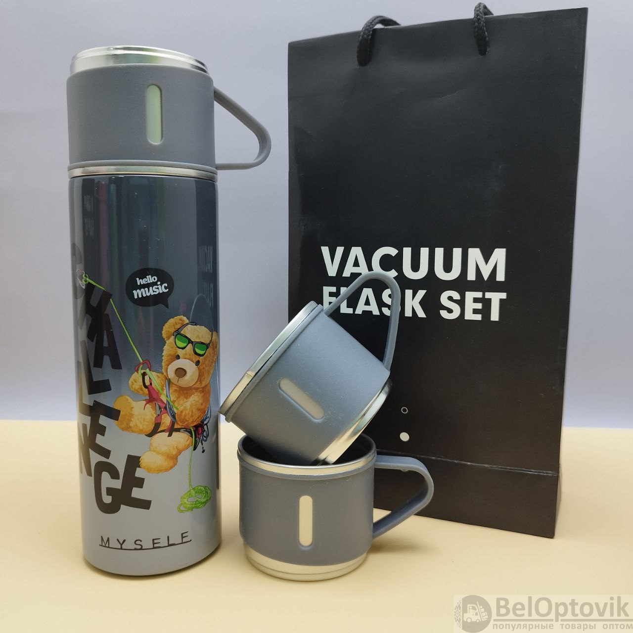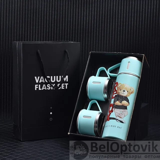 Купить Термос "Мишка" с тремя кружками Vacuum set / Подарочный набор с вакуумной изоляцией / 500 мл. на нашем сайте можно ОПТОМ от 20 шт. или не менее 5, если Вы покупаете у нас и другие товары (сборный заказ).