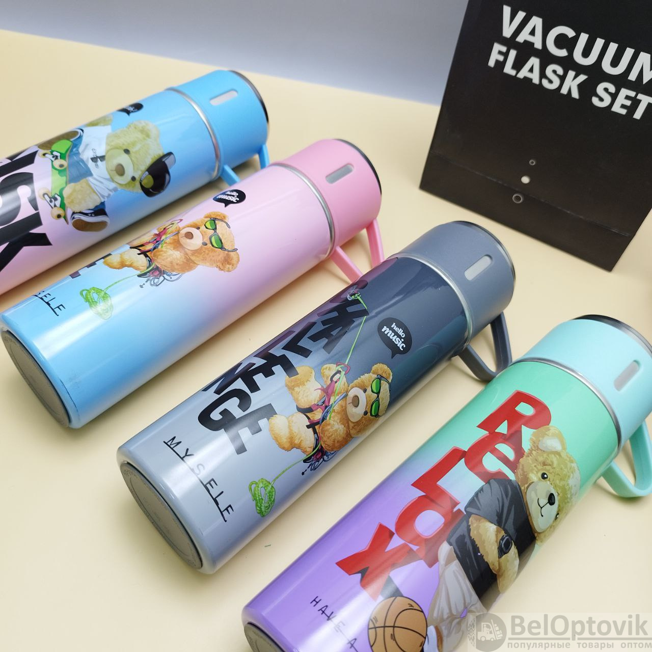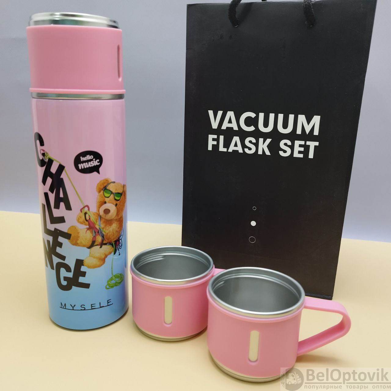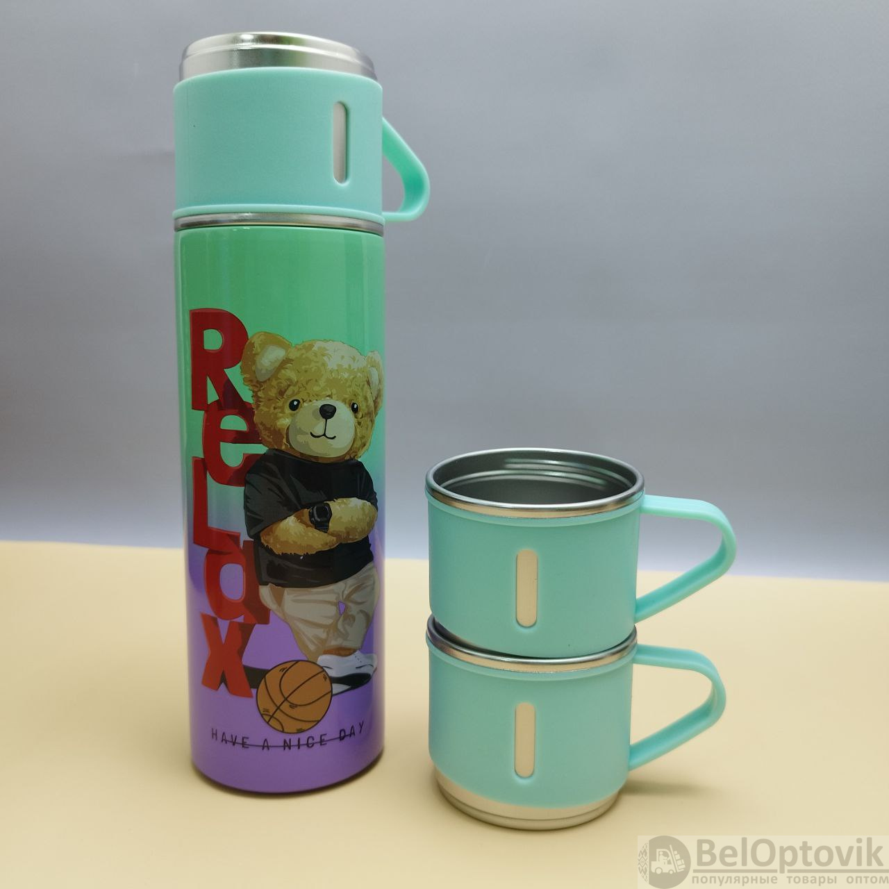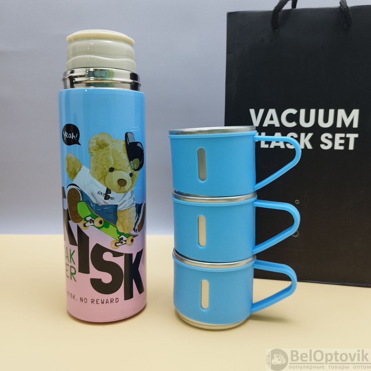 Купить Термос "Мишка" с тремя кружками Vacuum set / Подарочный набор с вакуумной изоляцией / 500 мл. на нашем сайте можно ОПТОМ от 20 шт. или не менее 5, если Вы покупаете у нас и другие товары (сборный заказ).
