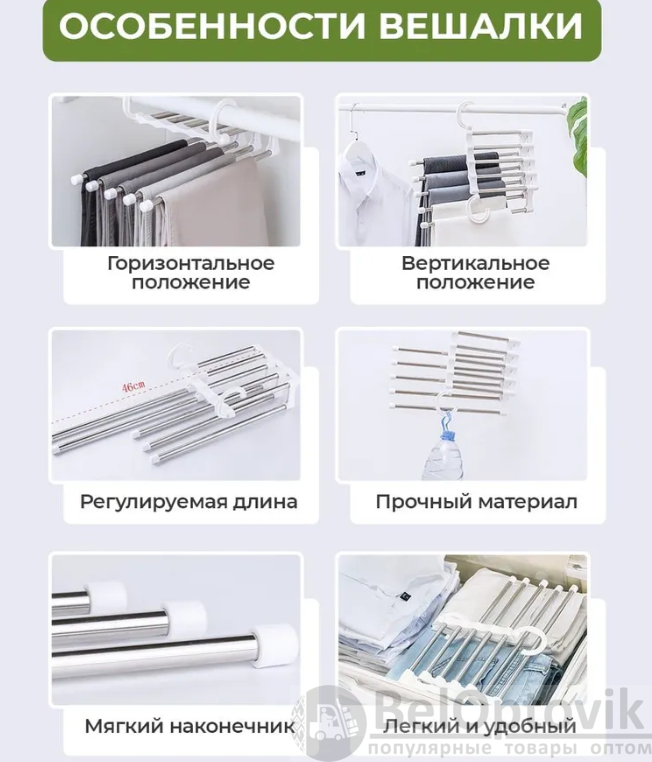 - возможность поместить на одной вешалке несколько пар брюк (что существенно экономит место в шкафу);