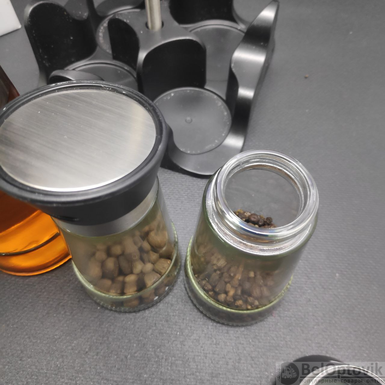 Набор включает в себя: подставка квадратная с держателем по центру и высокими устойчивыми выемками для надежного хранения емкостей, две емкости для сыпучих специй, две баночки для соусов. Крышки баночек поворотные: повернул в одну сторону- баночка открылась, в другую- закрылась. Бутылка для соуса закрывается крышкой с уплотнителем в цвет корпуса подставки, что позволяет сохранить соус от попадания мелких частиц мусора, мошек и пыли. Бутылку можно использовать для масла, соевого соуса, бальзамического уксуса и любого жидкого соуса. Корпус бутылки стеклянный, крышки пластмассовые.