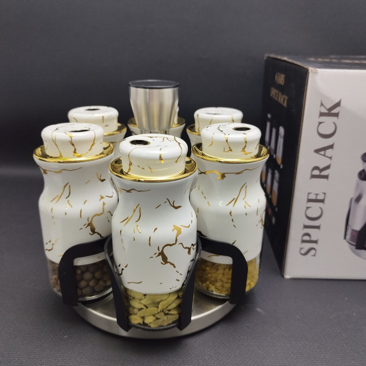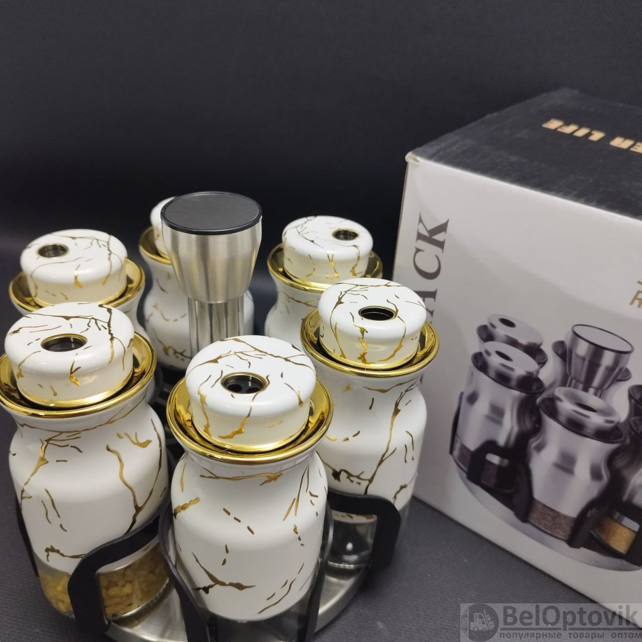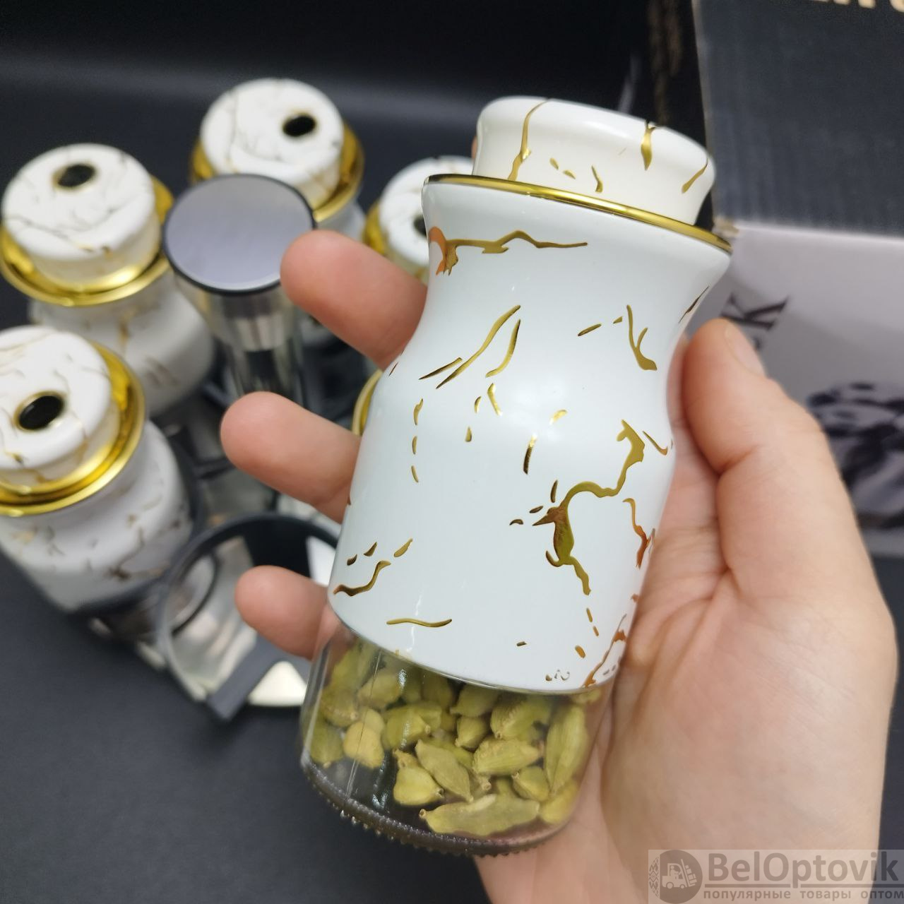 Красота, стиль, качество, удобство и функциональность - все это включает в себя набор для специи на вращающейся подставке. Баночки для специй в наборе для специй выполнены из прочного бессвинцового стекла. Подставка сделана из безопасного ABS пластика и нержавеющей стали. В набор входят 6 баночек для специй, в каждой крышке баночки 3 режима дозирования. Корпус баночки наполовину покрыт защитным мраморно-белым слоем из нержавеющей стали, что придает еще больше изящности и красоты набору.