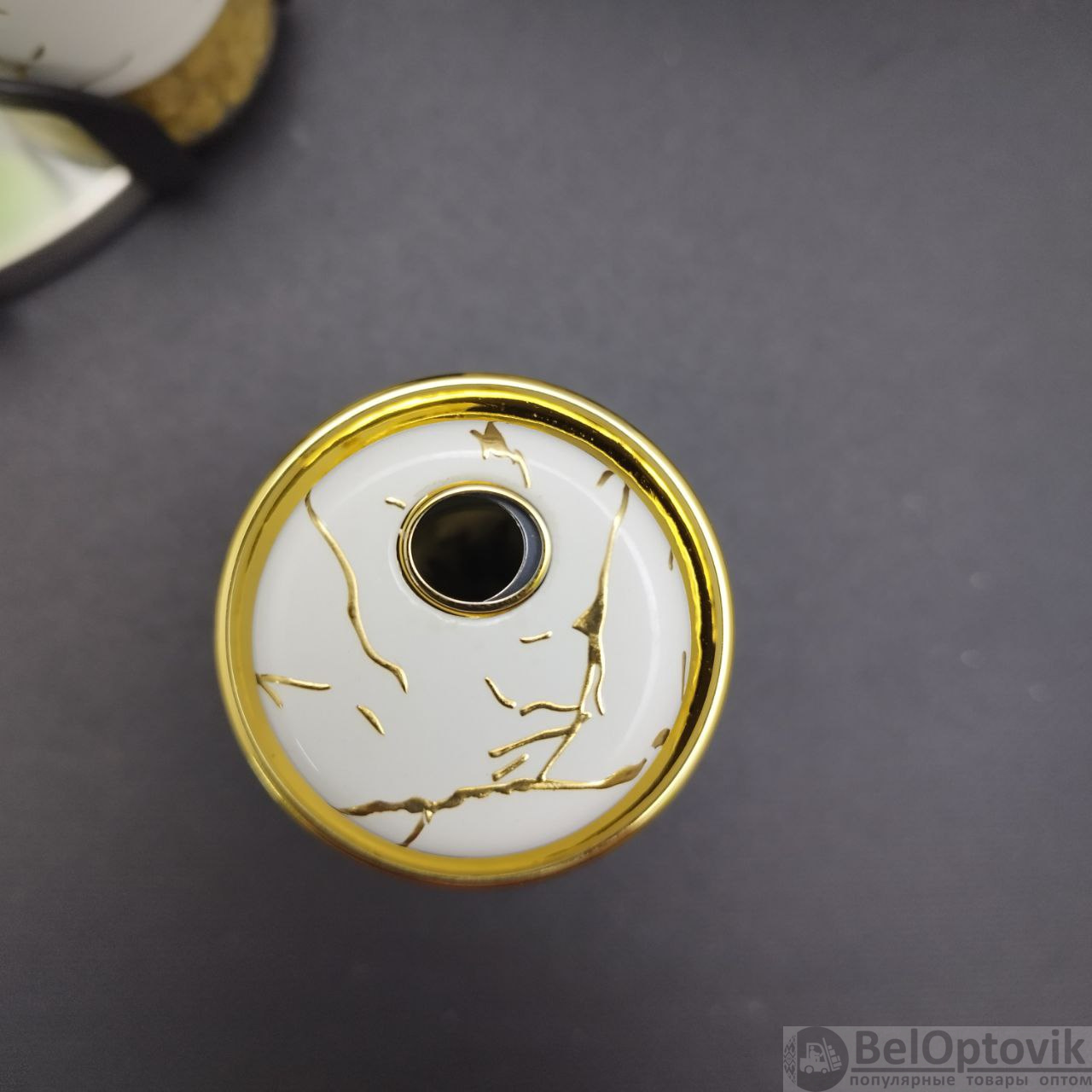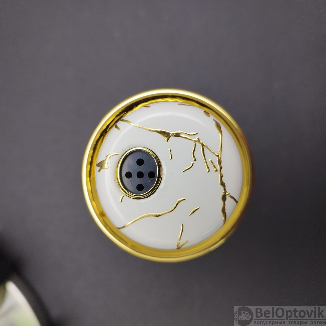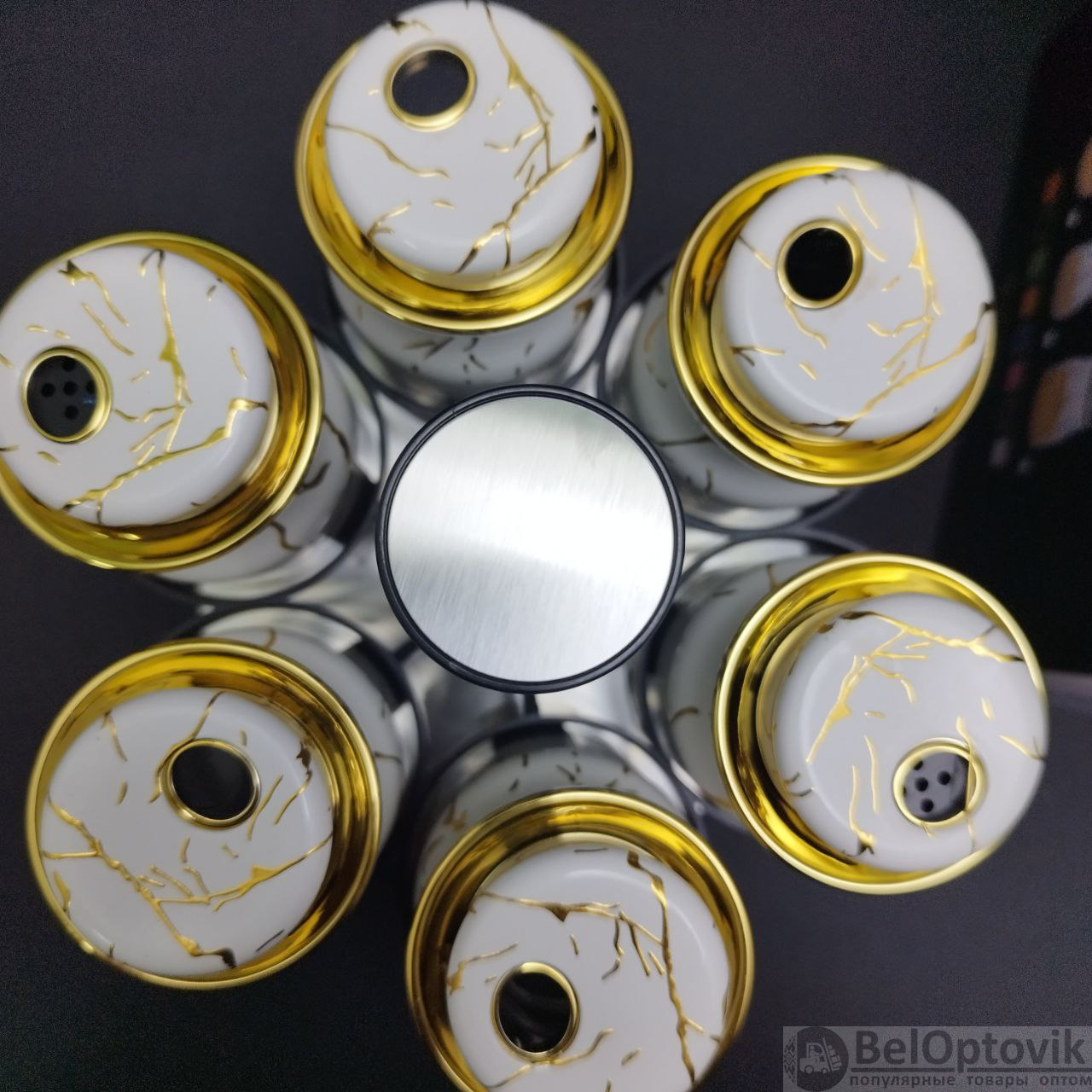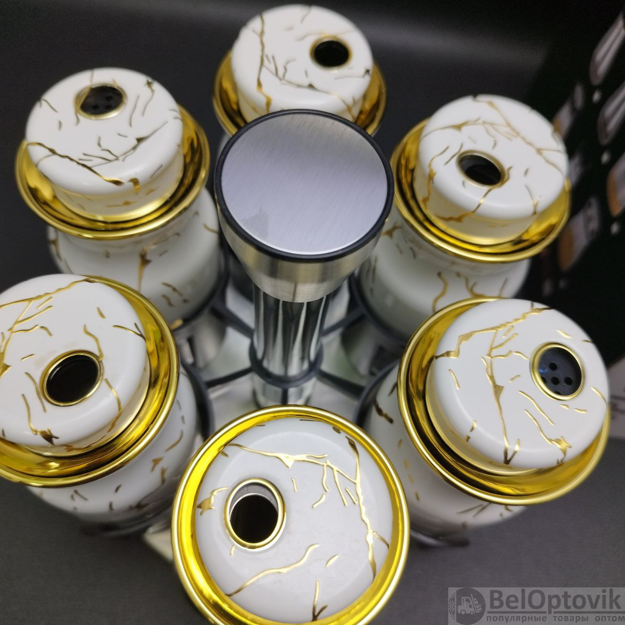 Цвет: баночки наполовину прозрачные и на половину бело-мраморные с золотыми вставками, металлическая подставка;