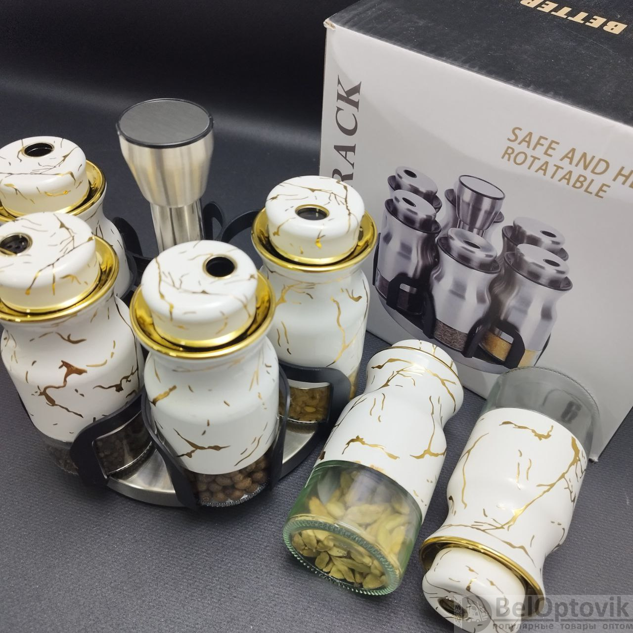 Почему купить Набор для специй на вращающейся подставке Spice Rack Elite 6 предметов / Органайзер на кухню / Набор емкостей для хранения приправ оптом выгодно у нас: