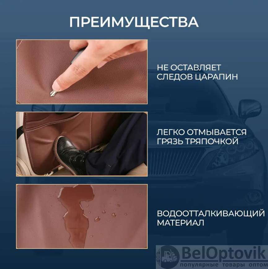 Модель выполнена из водонепроницаемой ткани, которая не только защит вещи от влаги, но и не даст жидкости вытечь из кармашков, например, если находящаяся внутри бутылка протечет. Сама тканевая основа, при необходимости, позволяет компактно свернуть органайзер и убрать на хранение в багажник. Крепится изделие на спинку переднего сиденья на подголовник накидывается петля, а нижними креплениями притягивается к спинке. Карманы и отделения расположены на такой высоте, чтобы не мешать ногам. Такое решение не создает неудобств пассажирам ни на переднем и на задних сиденьях.