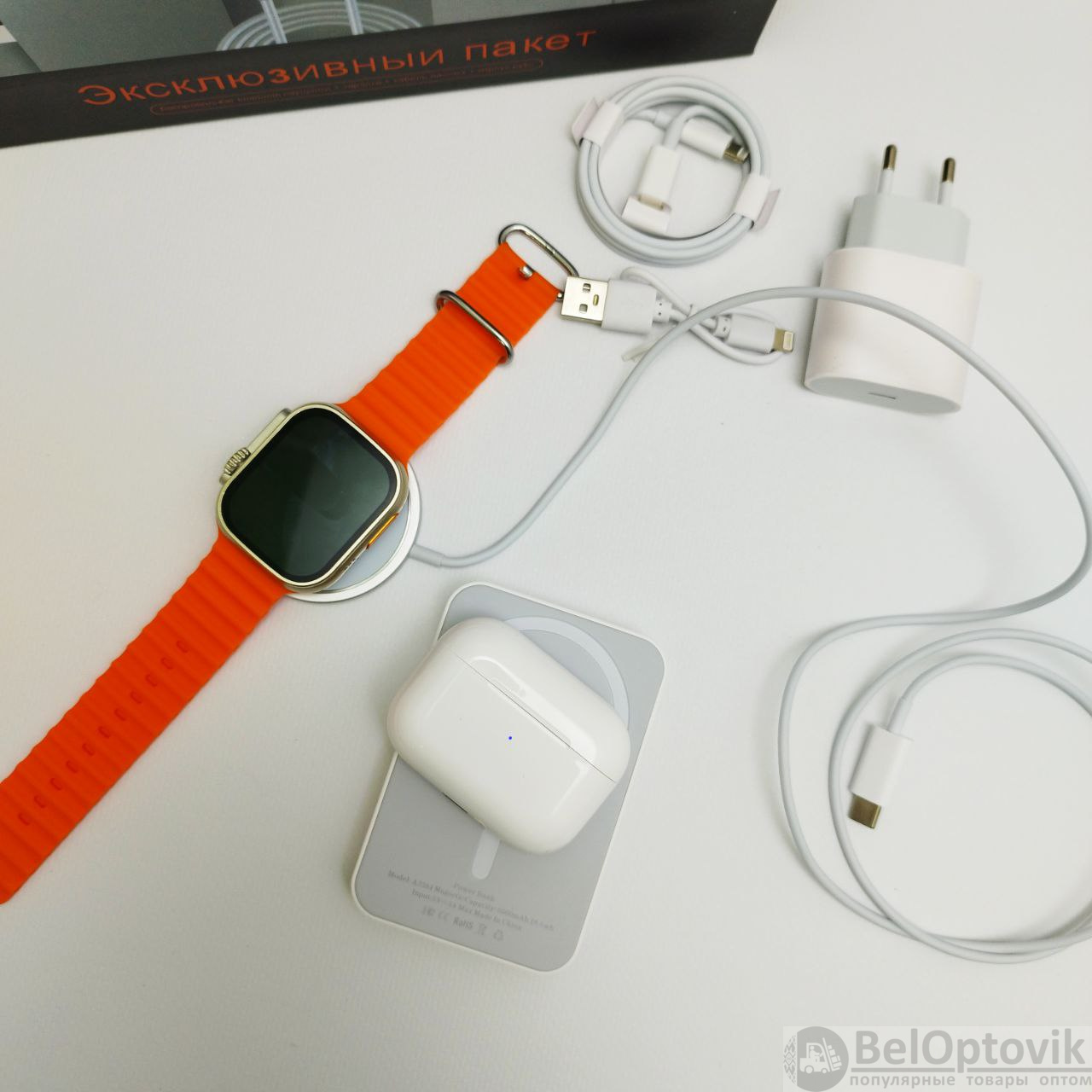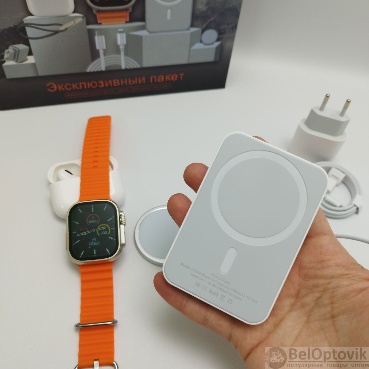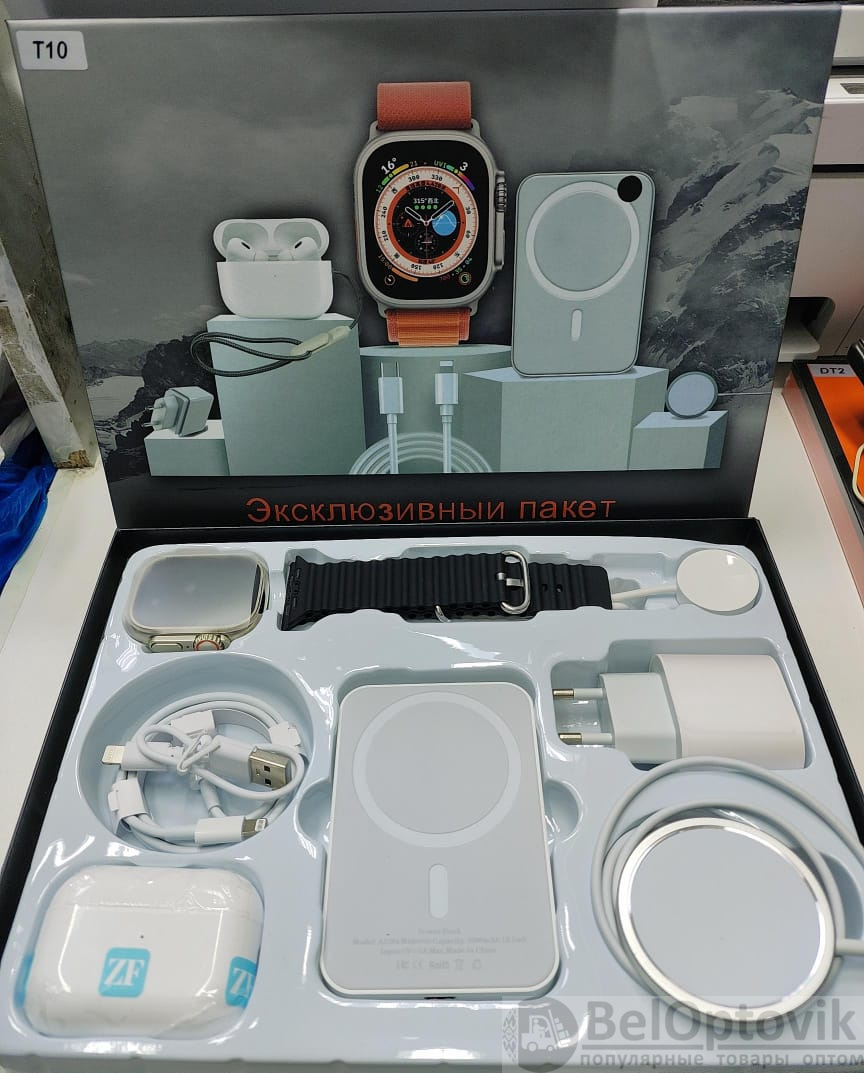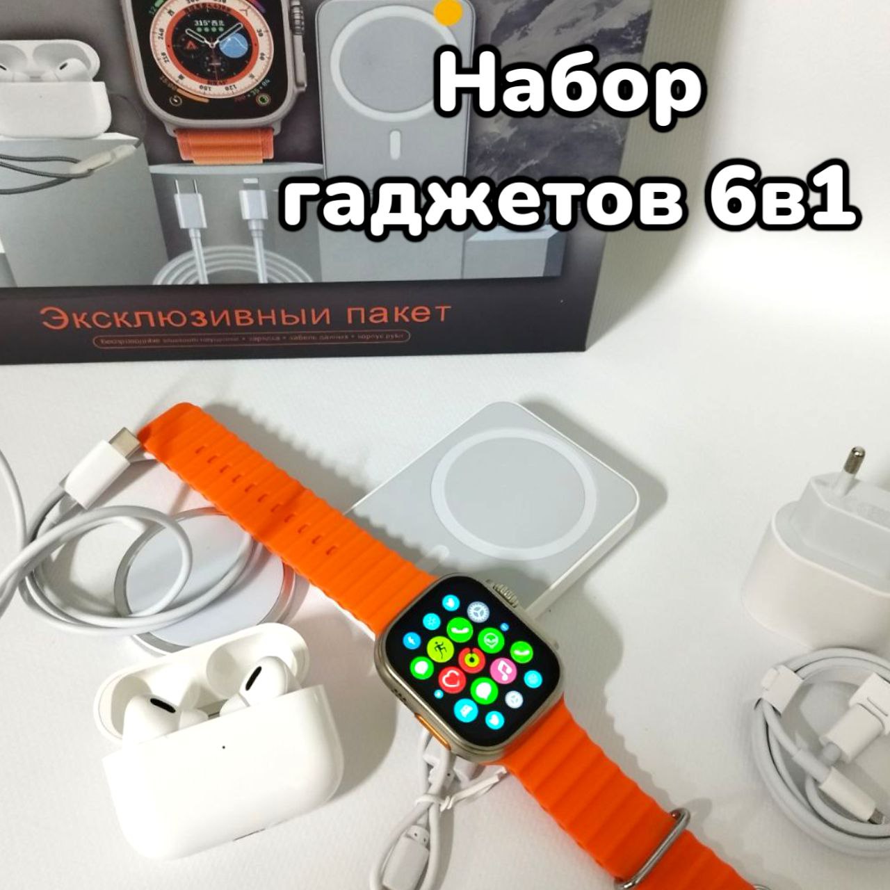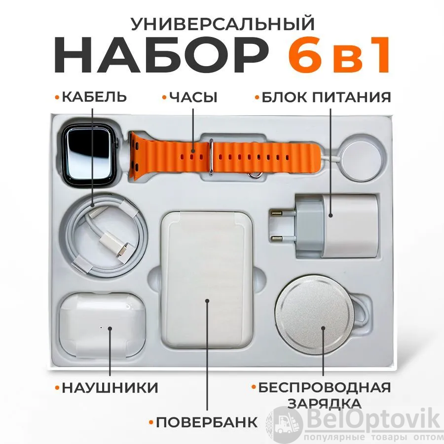 Купить Набор для смартфона 6 в 1 (умные часы, наушники в зарядном боксе, powerbank, зарядка для часов, беспроводная зарядка для смартфона, адаптер питания) на нашем сайте можно ОПТОМ от 20 шт. или меньше, если Вы покупаете у нас и другие товары
