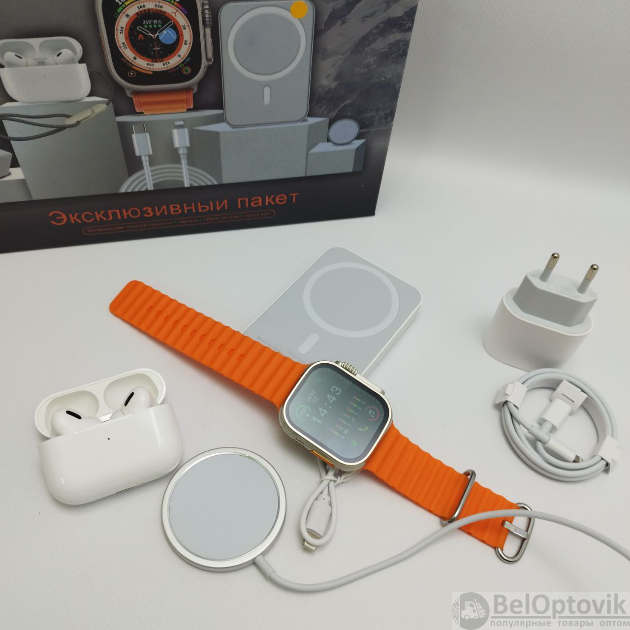 Важным компонентом набора является повербанк - это портативный и удобный для переноски блок питания, который позволяет заряжать ваши смарт-часы и другие устройства в любом месте. Комплект также включает в себя беспроводные наушники, что является отличным дополнением и даёт возможность наслаждаться качественным звуком и свободно общаться по телефону. Беспроводная зарядка - это еще одна удобная составляющая набора, с ней вы можете заряжать smart watch или другие поддерживаемые устройства, просто положив их на беспроводное зарядное устройство. Дополнительными аксессуарами в наборе являются блок питания и кабель type-с/lighting. Этот блок питания обеспечит вам возможность быстро и удобно заряжать все устройства набора и другие устройства, которые могут понадобиться вам в повседневной жизни.