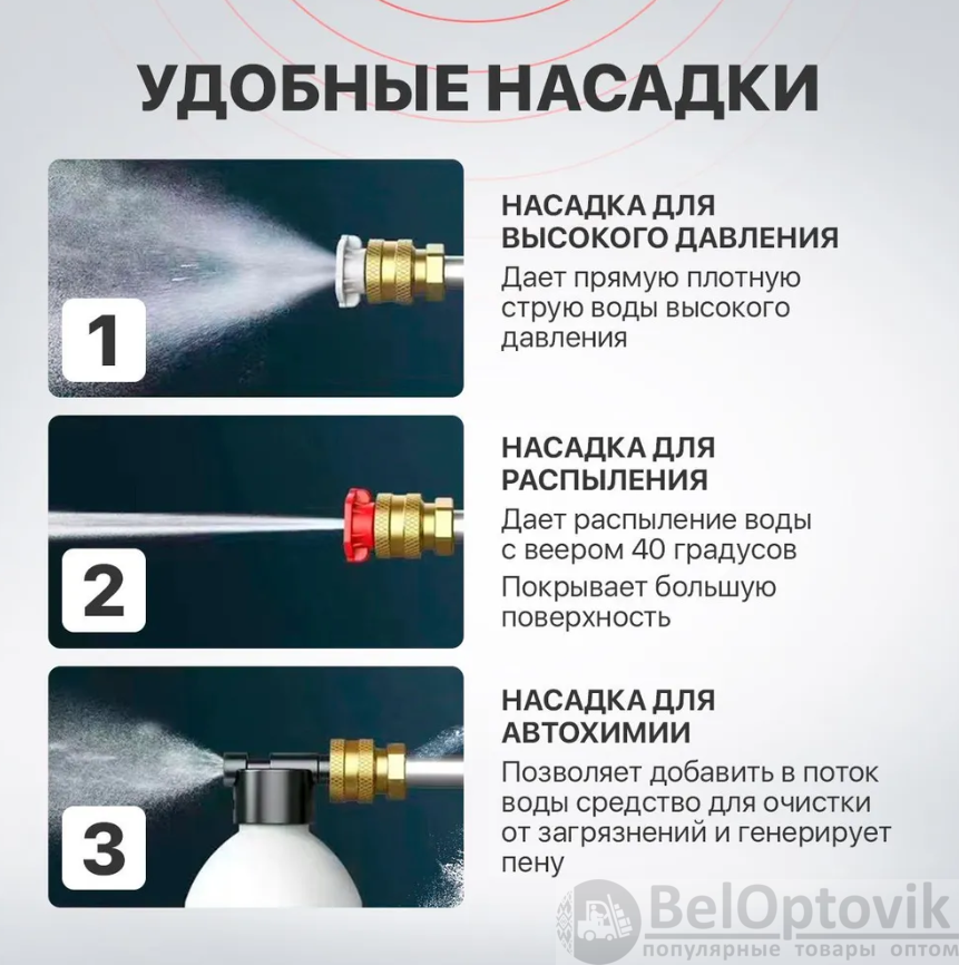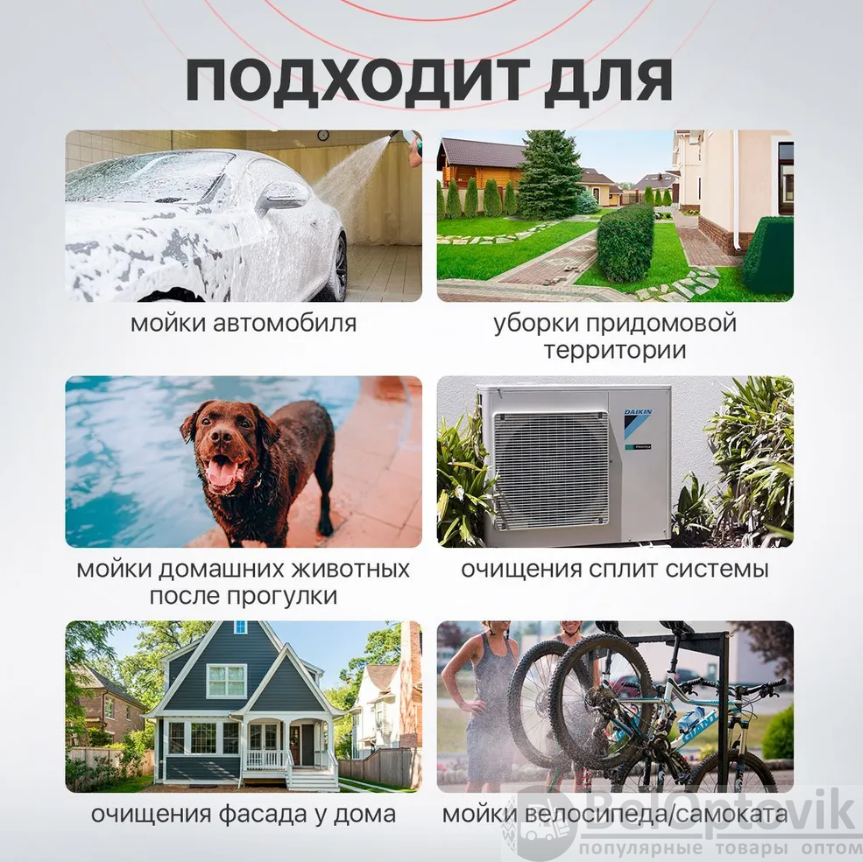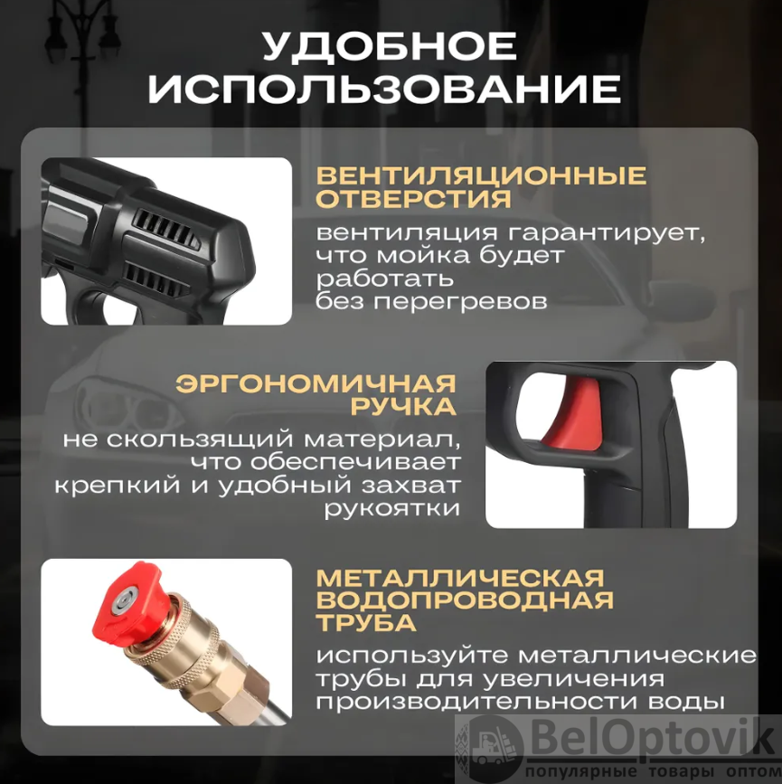 Мойка высокого давления для автомобиля – ваш универсальный помощник в гараже, во дворе дома и на даче! Автомойка высокого давления поможет качественно очистить: ковры, окна, садовые аксессуары и инвентарь, бытовые предметы и многое другое. Автомойка аккумуляторная позволяет эффективно удалять большой слой пыли и твердую присохшую грязь с любых транспортных средств (автомобиль, мотоцикл, велосипед и т.д.).