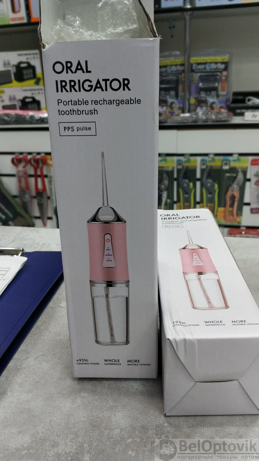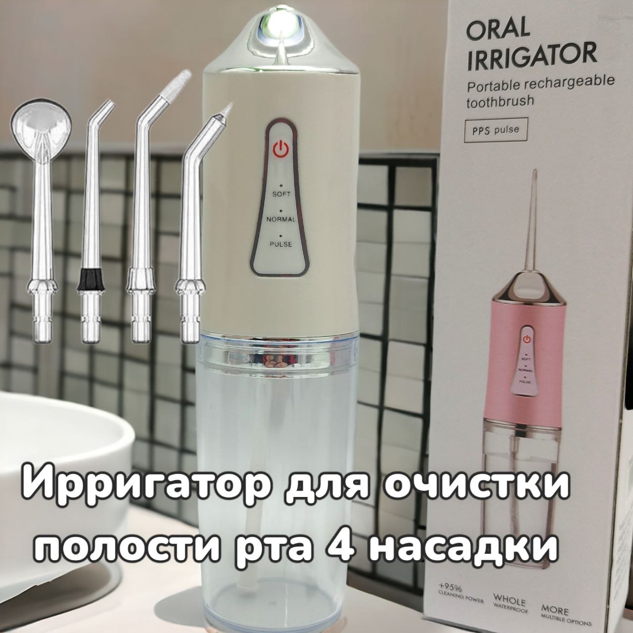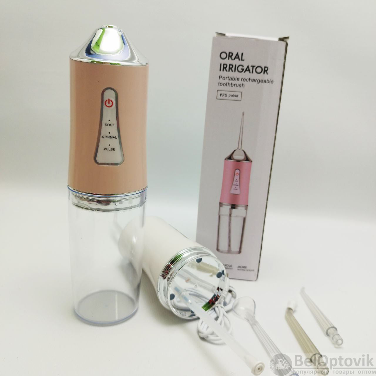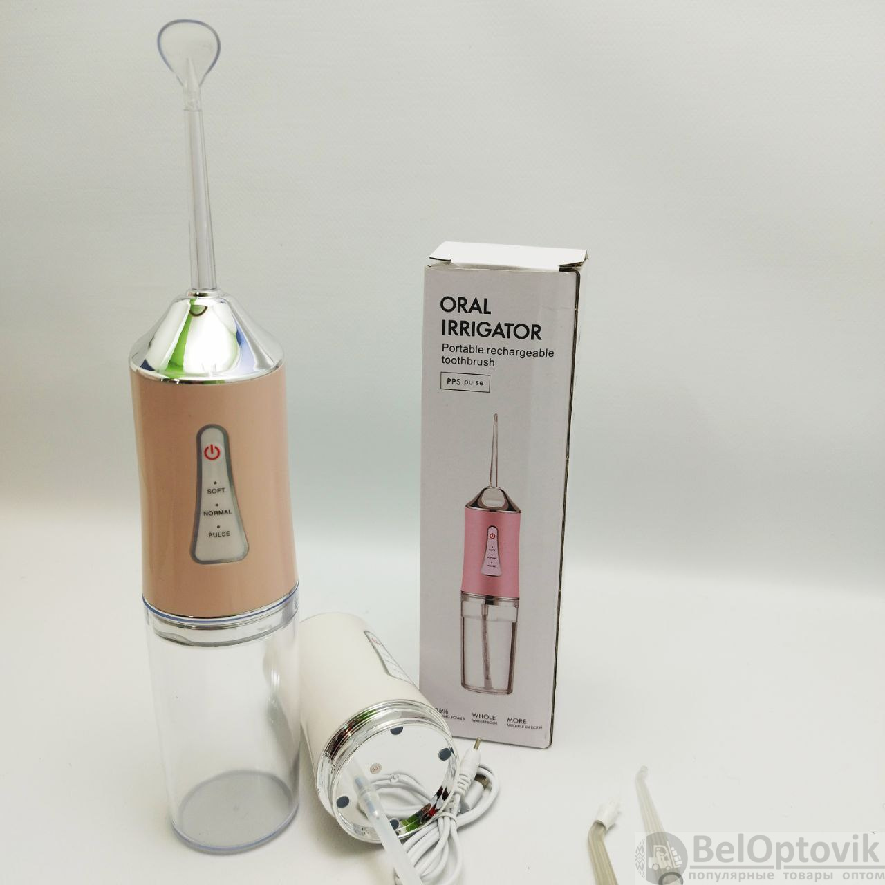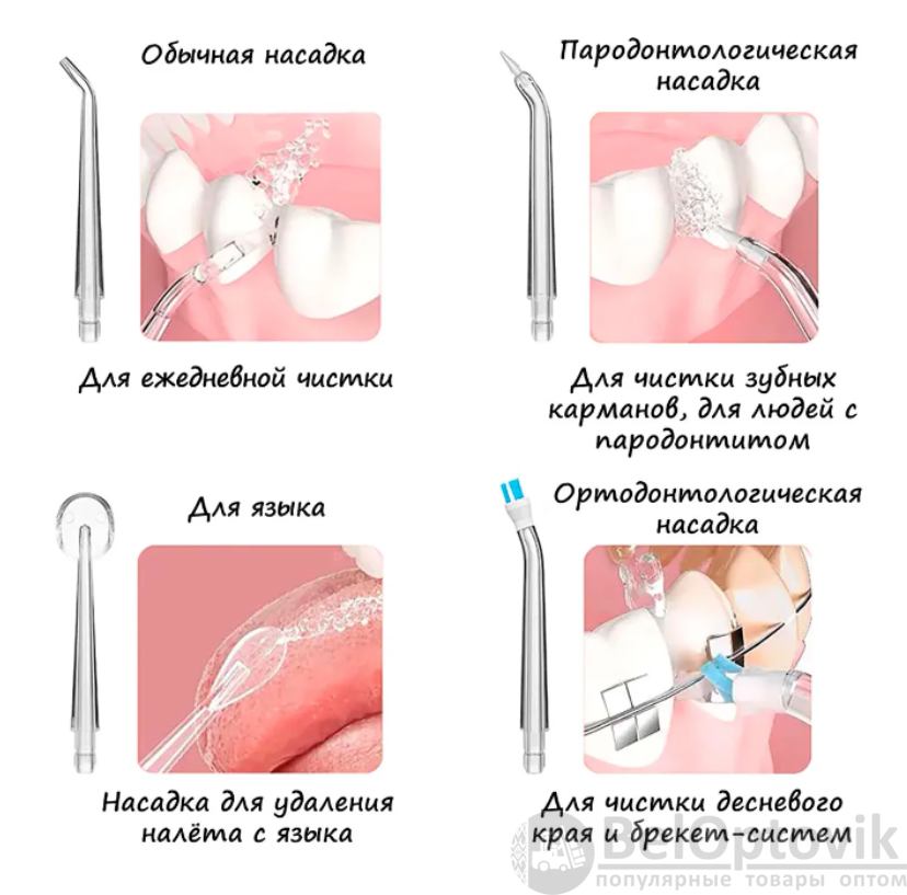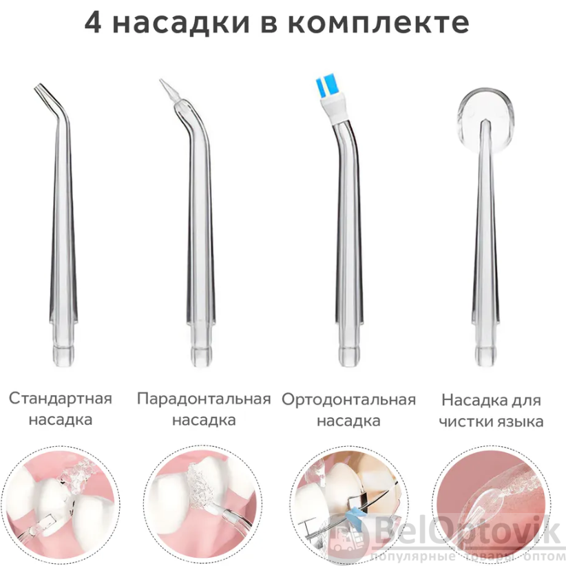 Купить Ирригатор (флоссер) для ухода за брекетами/гигиены полости рта/ 4 сменные насадки на нашем сайте можно ОПТОМ от 20 шт. или не менее 5, если Вы покупаете у нас и другие товары (сборный заказ).